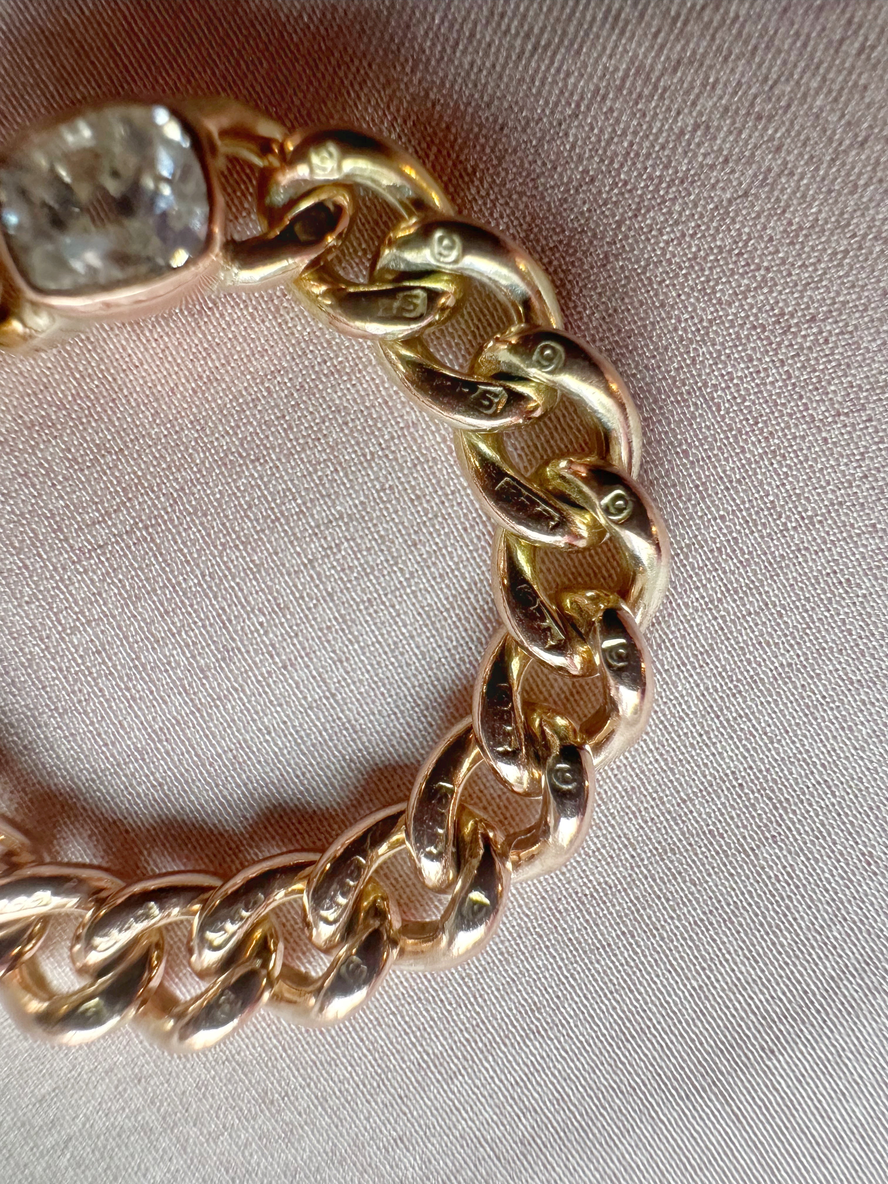 The chain is 4.6mm wide and stamped to every link for 9ct gold. The gold is peachy in tone - not yellow, not rose.