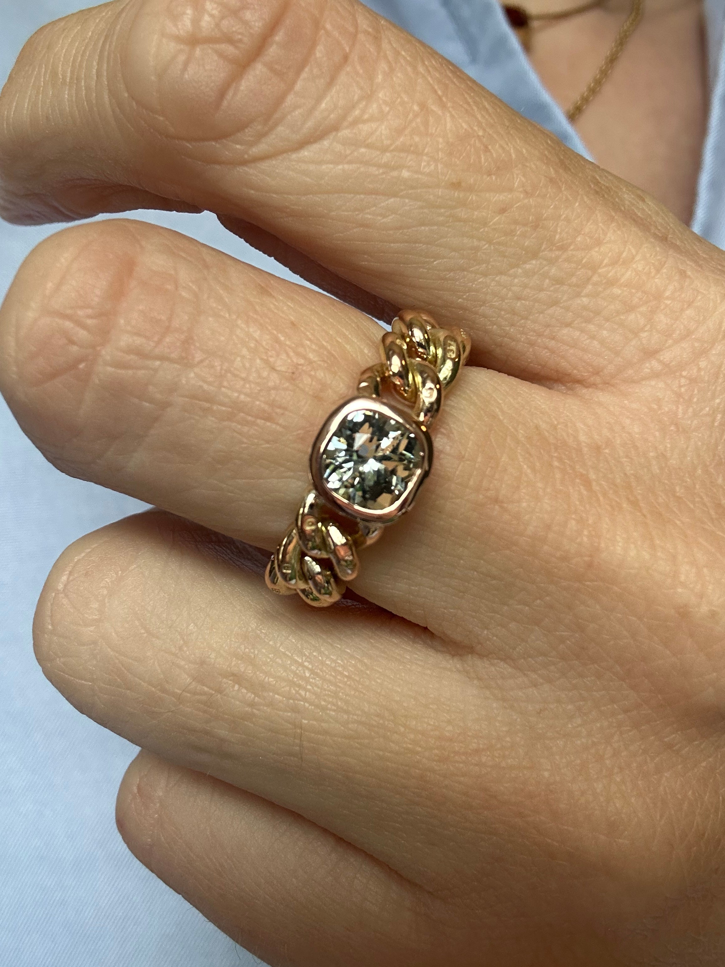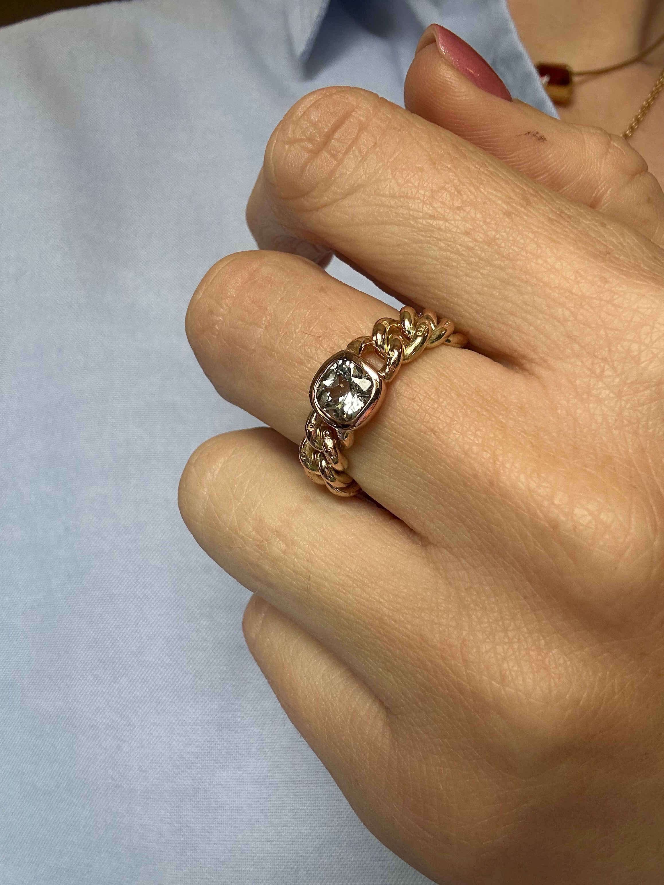 We have set the most wonderfu cushion cut l gray-green Sri Lankan sapphire to the centre, weighing 1.2ct. The chain itself is a unique warm yellow tone (you never know what colour they'll take after a polish, part of the fun of these pieces!) and the bezel is rose gold, which really makes the stone pop.