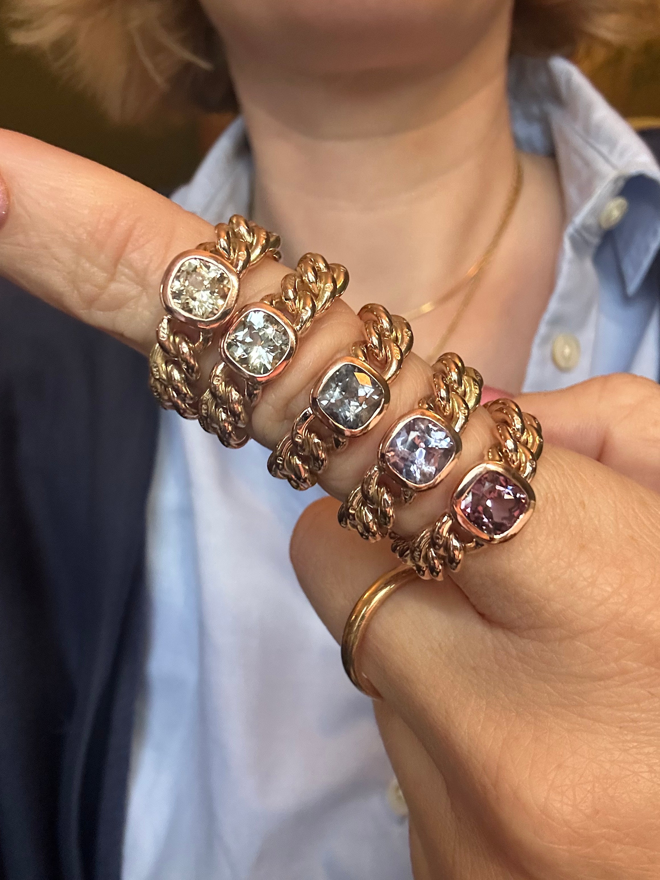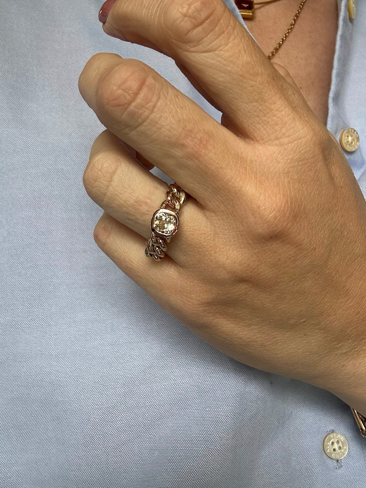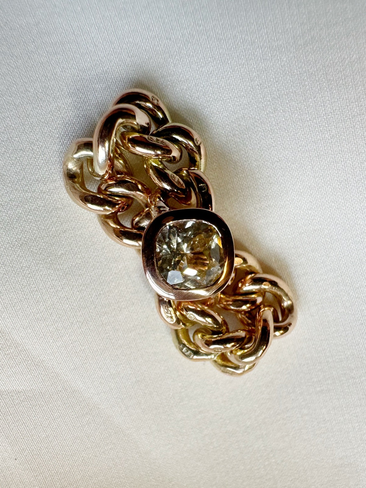 We have set a stunning cushion cut butter yellow Sri Lankan sapphire to the centre, weighing 1.3ct. The chain itself is a unique warm yellow tone (you never know what colour they'll take after a polish, part of the fun of these pieces!) and the bezel is rose gold, which really makes the stone pop.