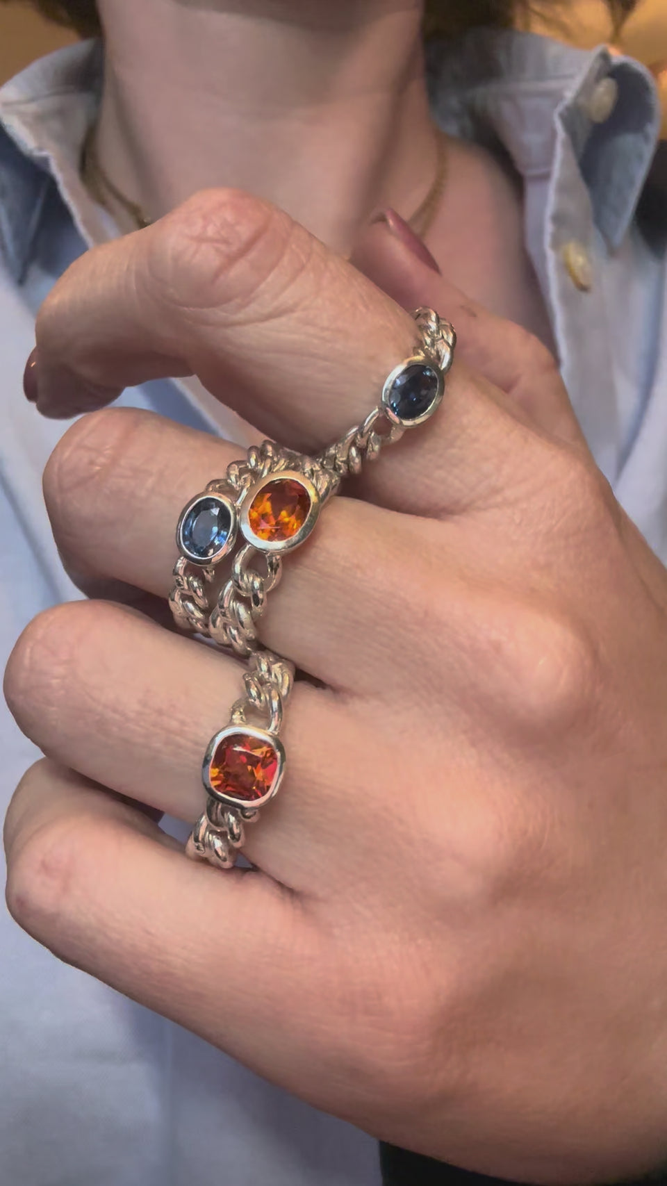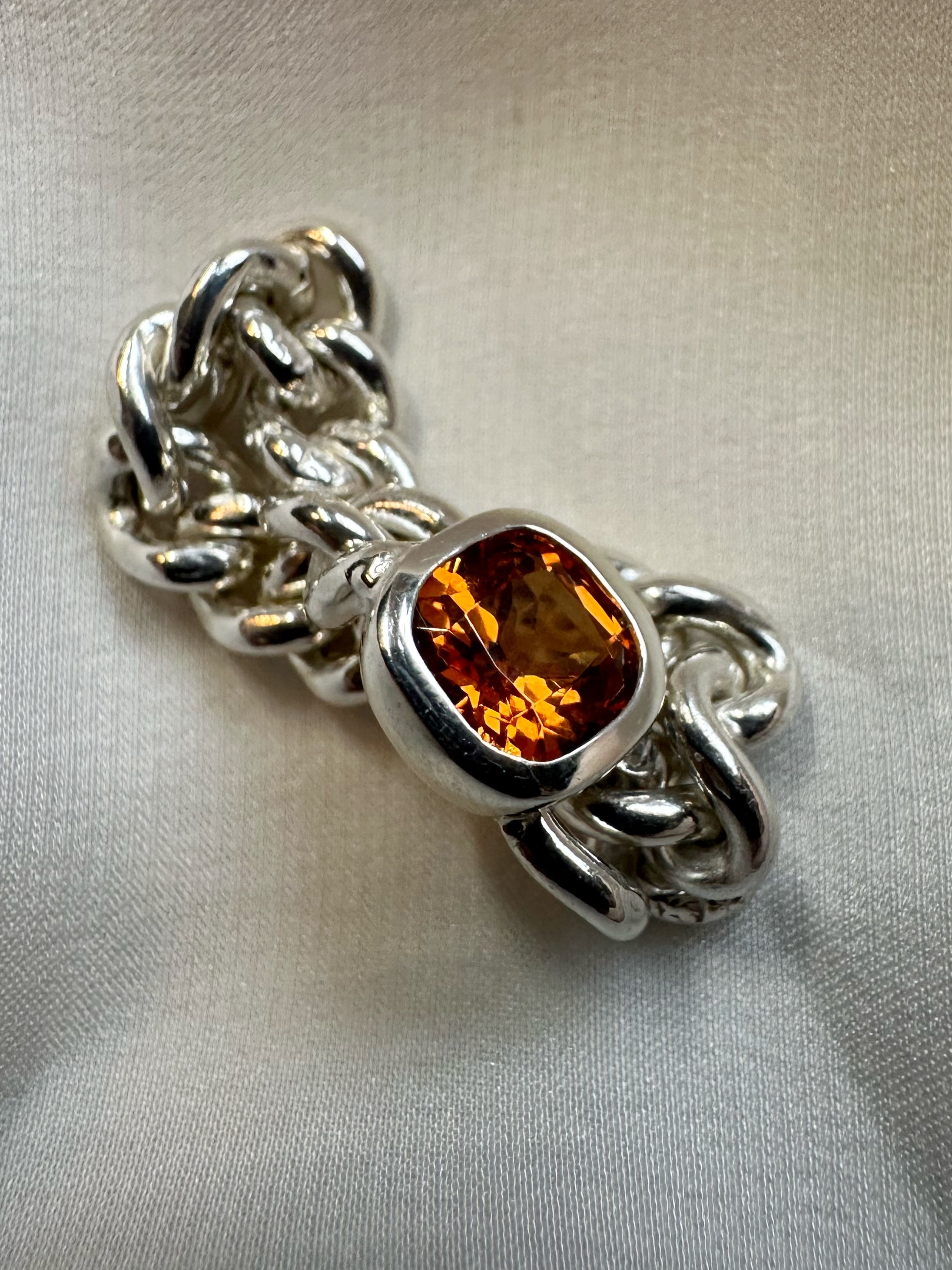 We have set an oval, vibrant spessartine garnet to the centre, weighing 1.5ct. The chain itself is hallmarked to each link with the lion passant and the cool silver tone works so well with the zesty orange stone.