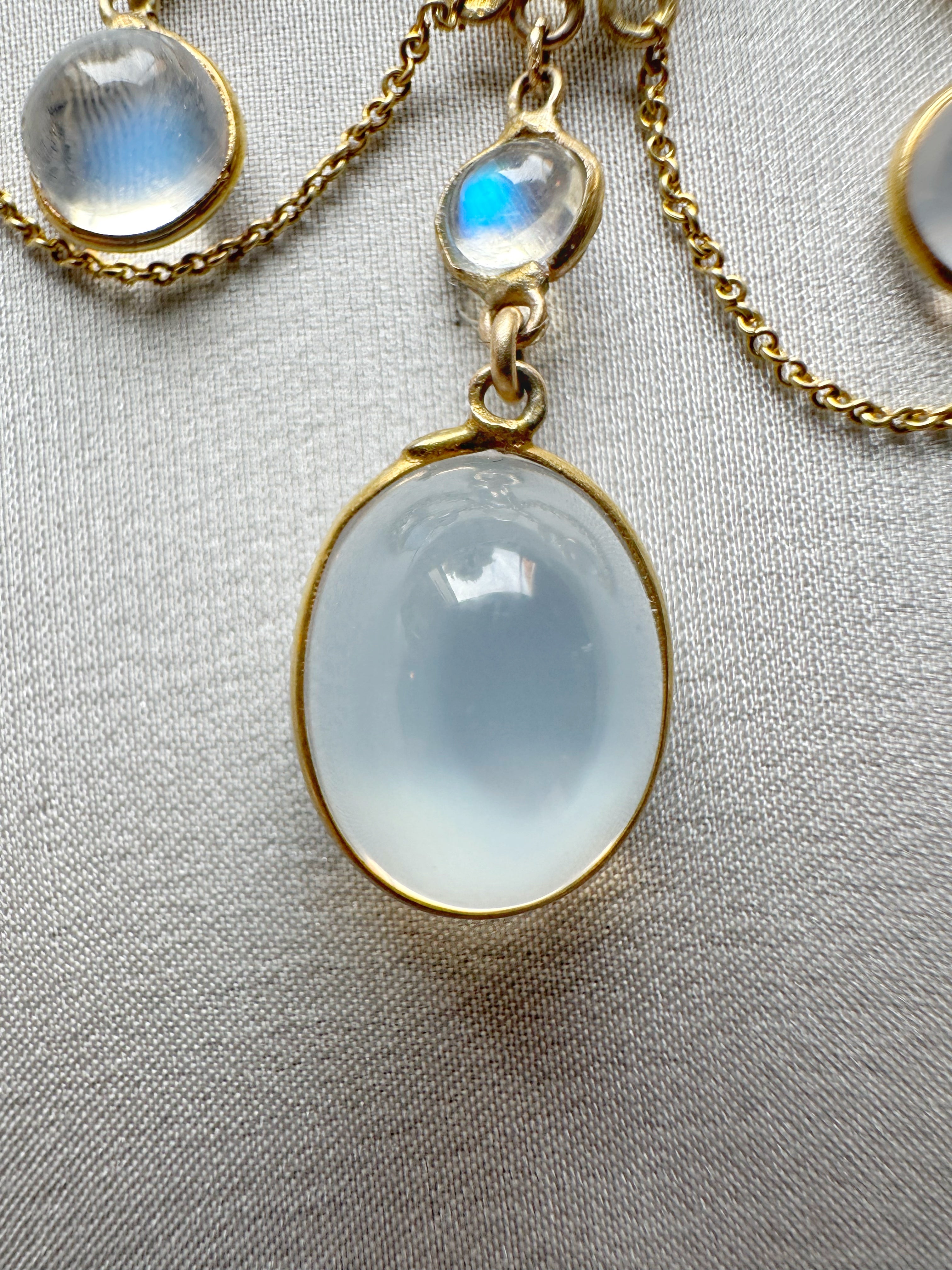 The clasp fastens with a bolt ring and the piece is in very good antique condition. I suspect the moonstone above the largest stone at the bottom could be a replacement as the underside is slightly flatter than the other stones, but all looks perfectly in keeping from the front.