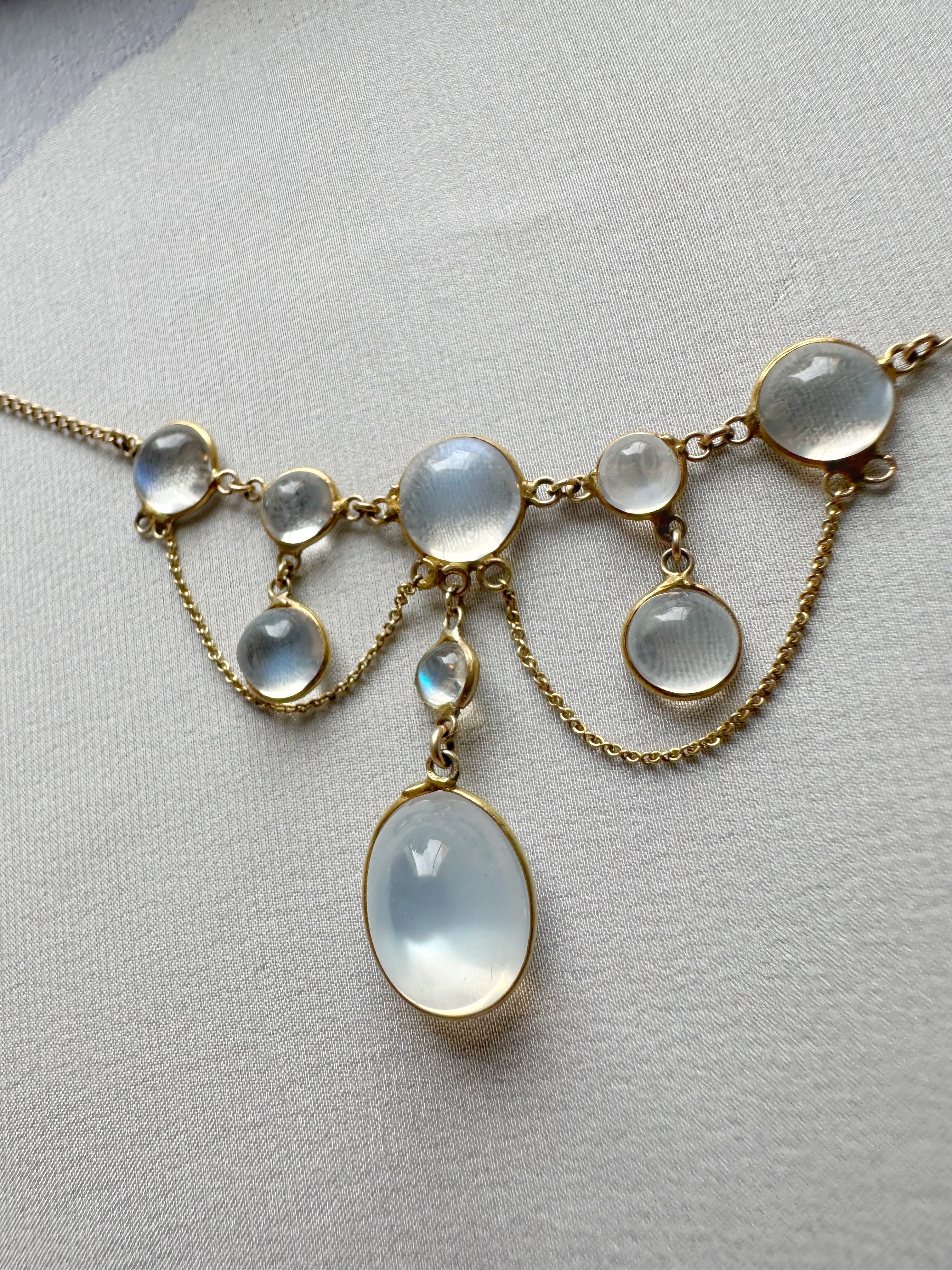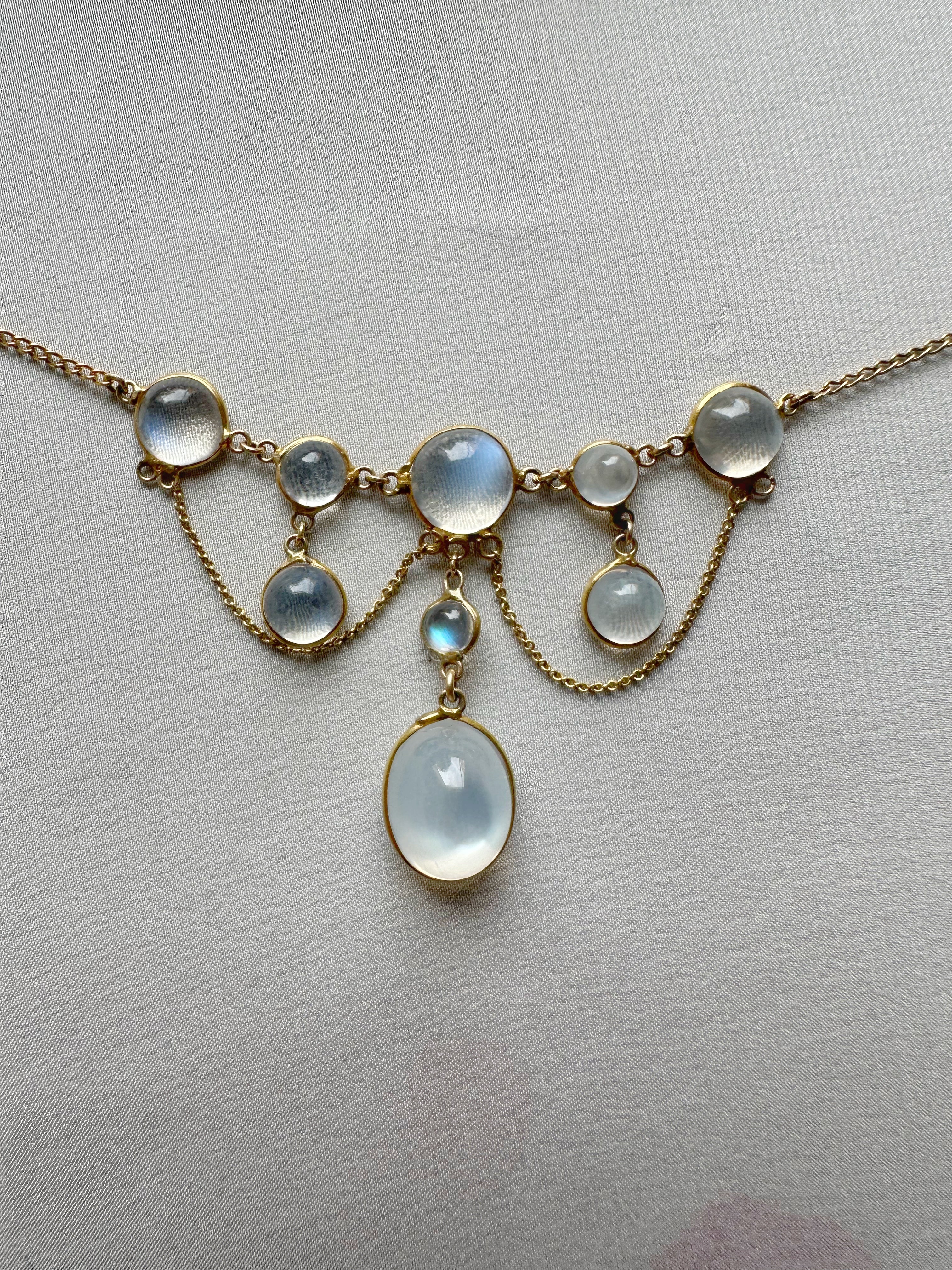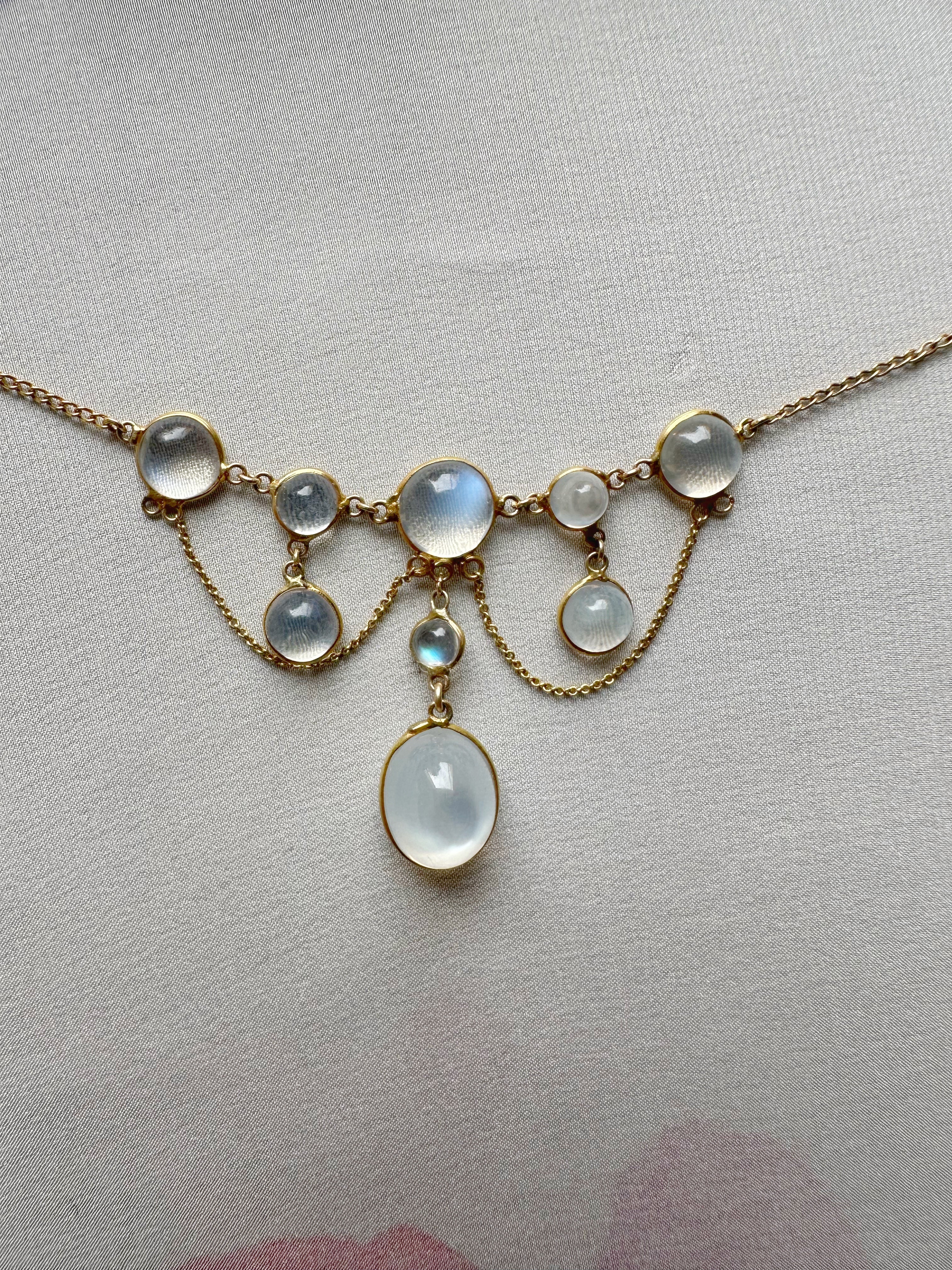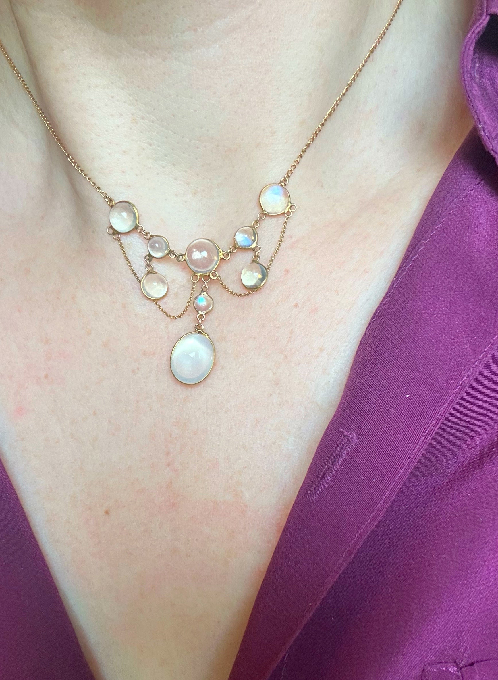 The stone really leans in to this festoon style of necklace, popular in the early 1900s which is when this piece dates to. Each stone has been framed in a delicate ribbon of gold and this piece looks so elegant when worn.