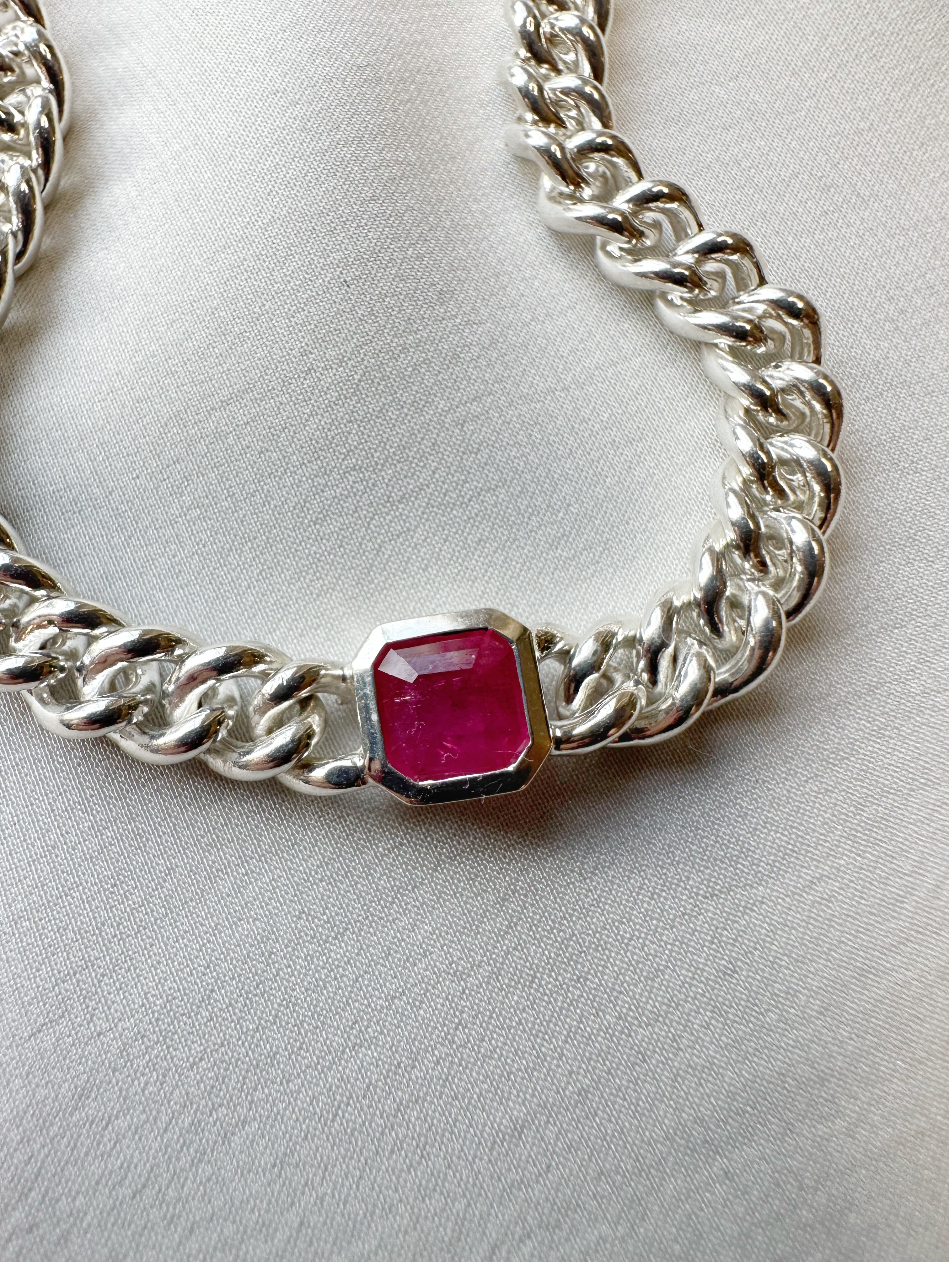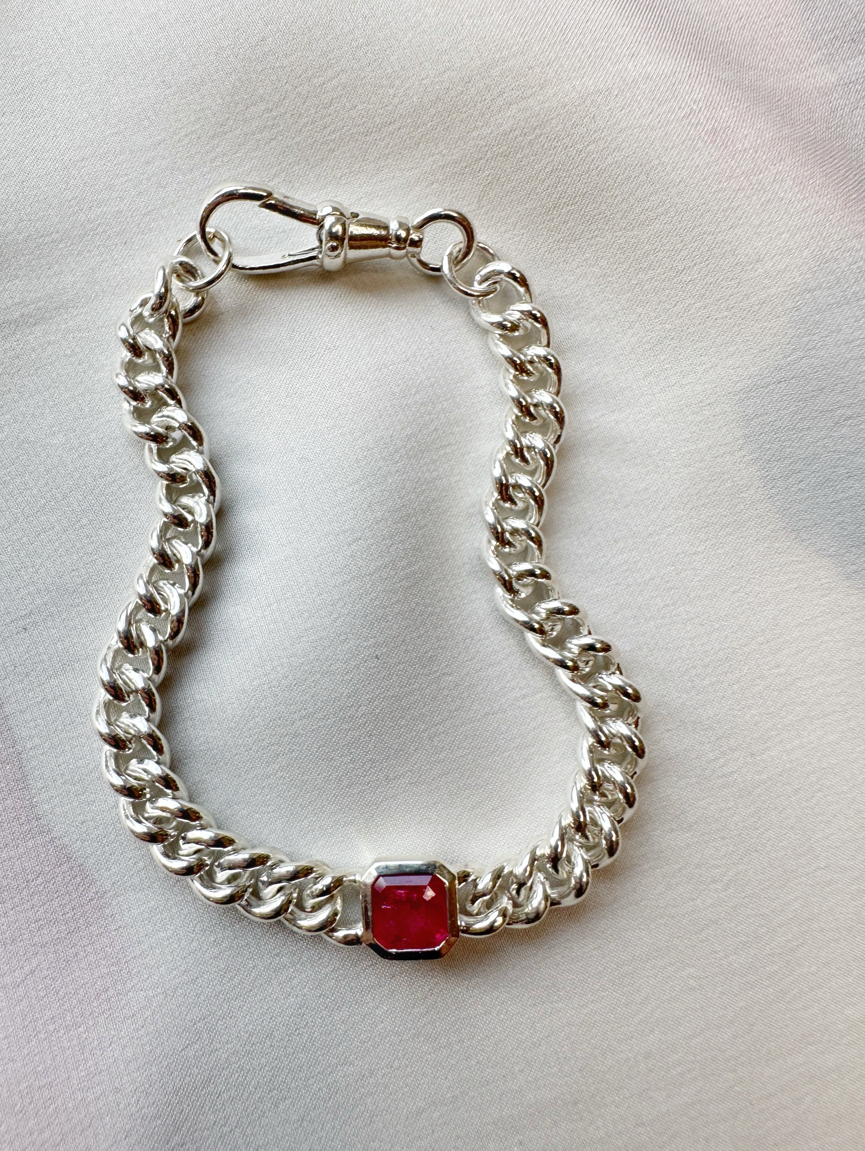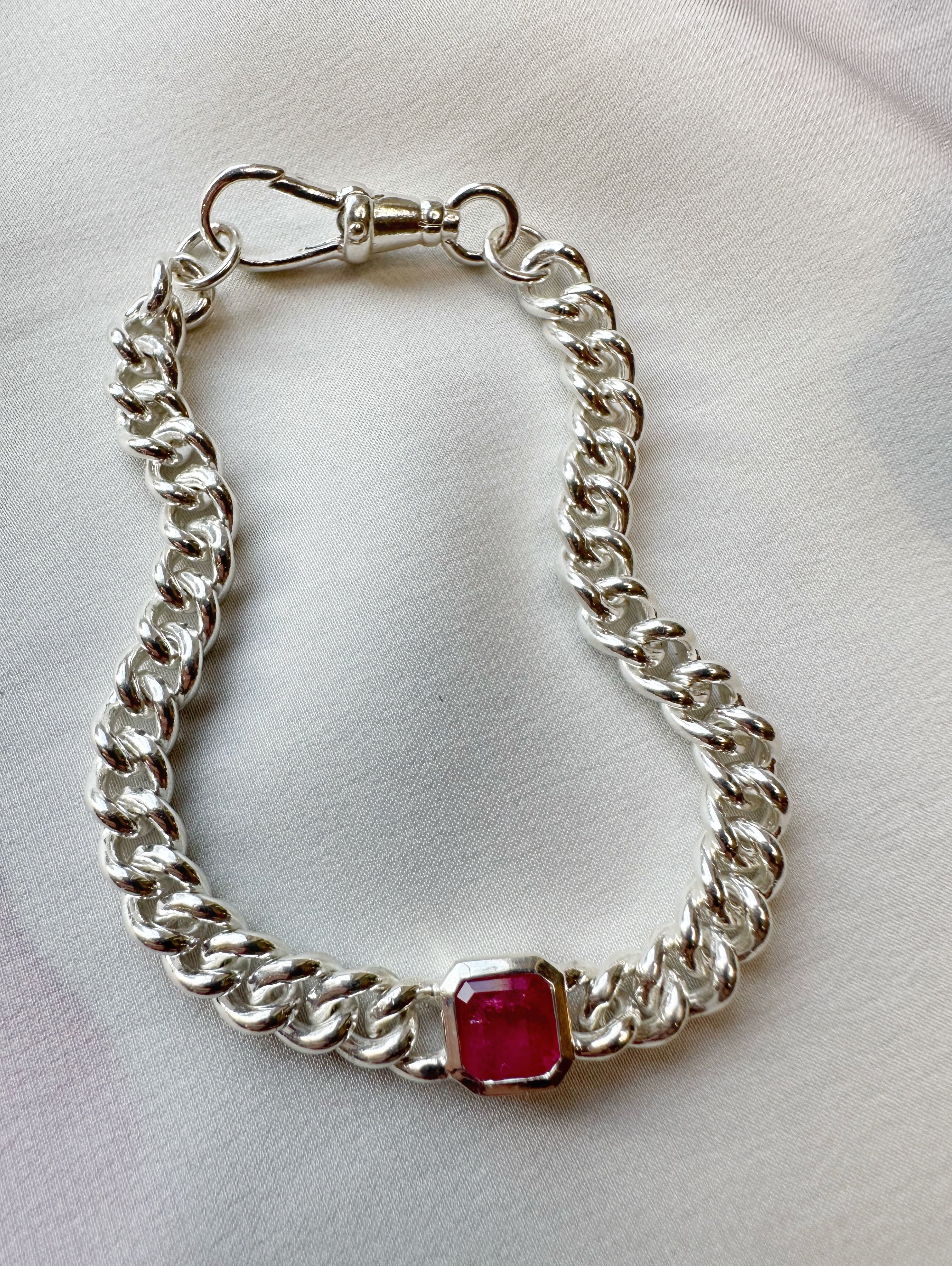 This classic curb chain is made of solid silver (it is not hollow) and finished with a dog clasp, it is ungraduated and the links are 5.4mm wide. The chain was newly made in the UK and we have bezel set the stone with our very pleasing bubble back setting.