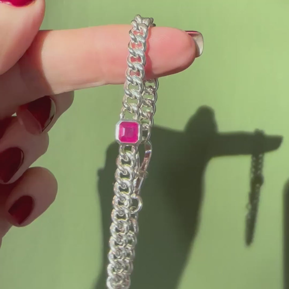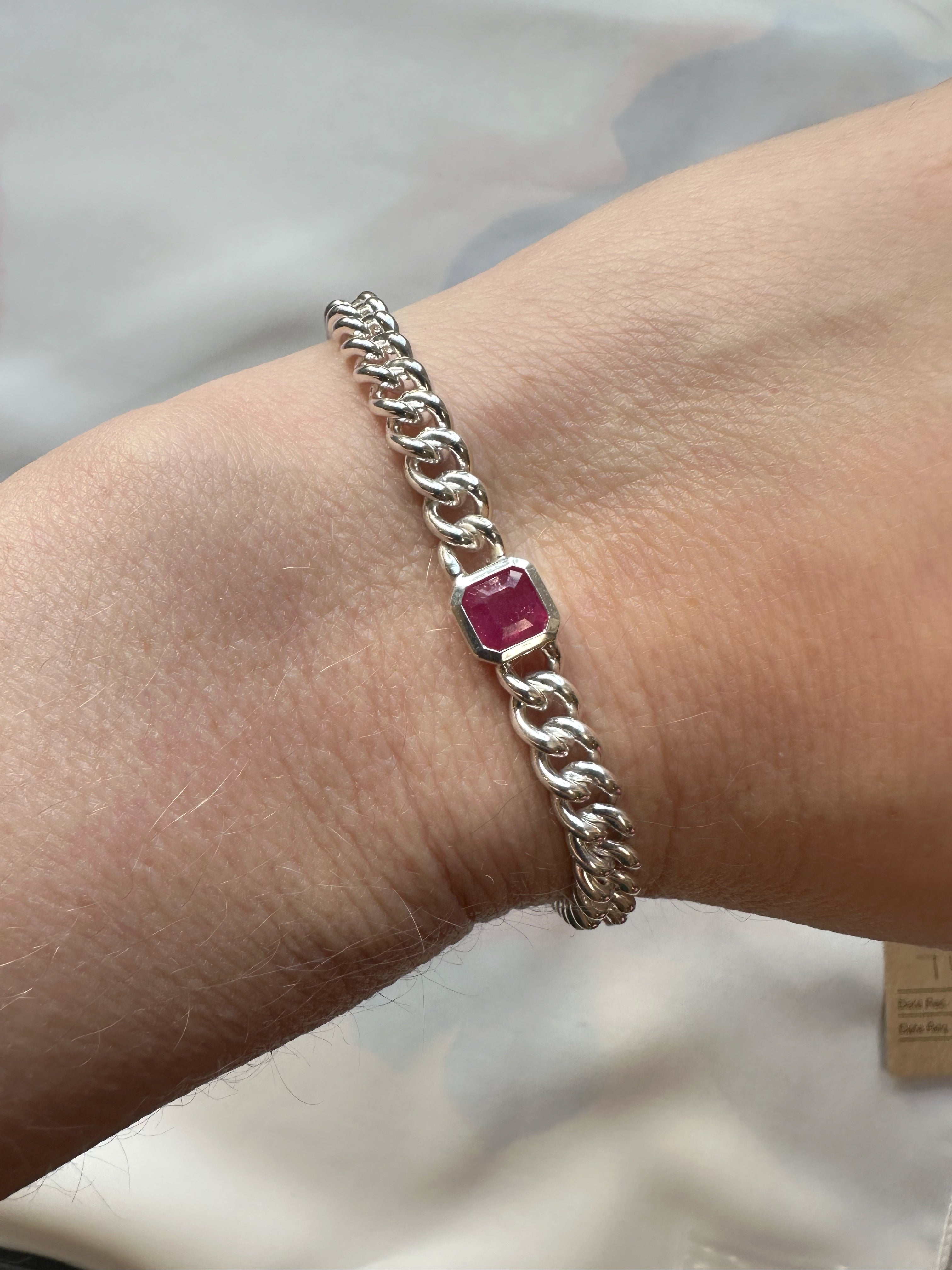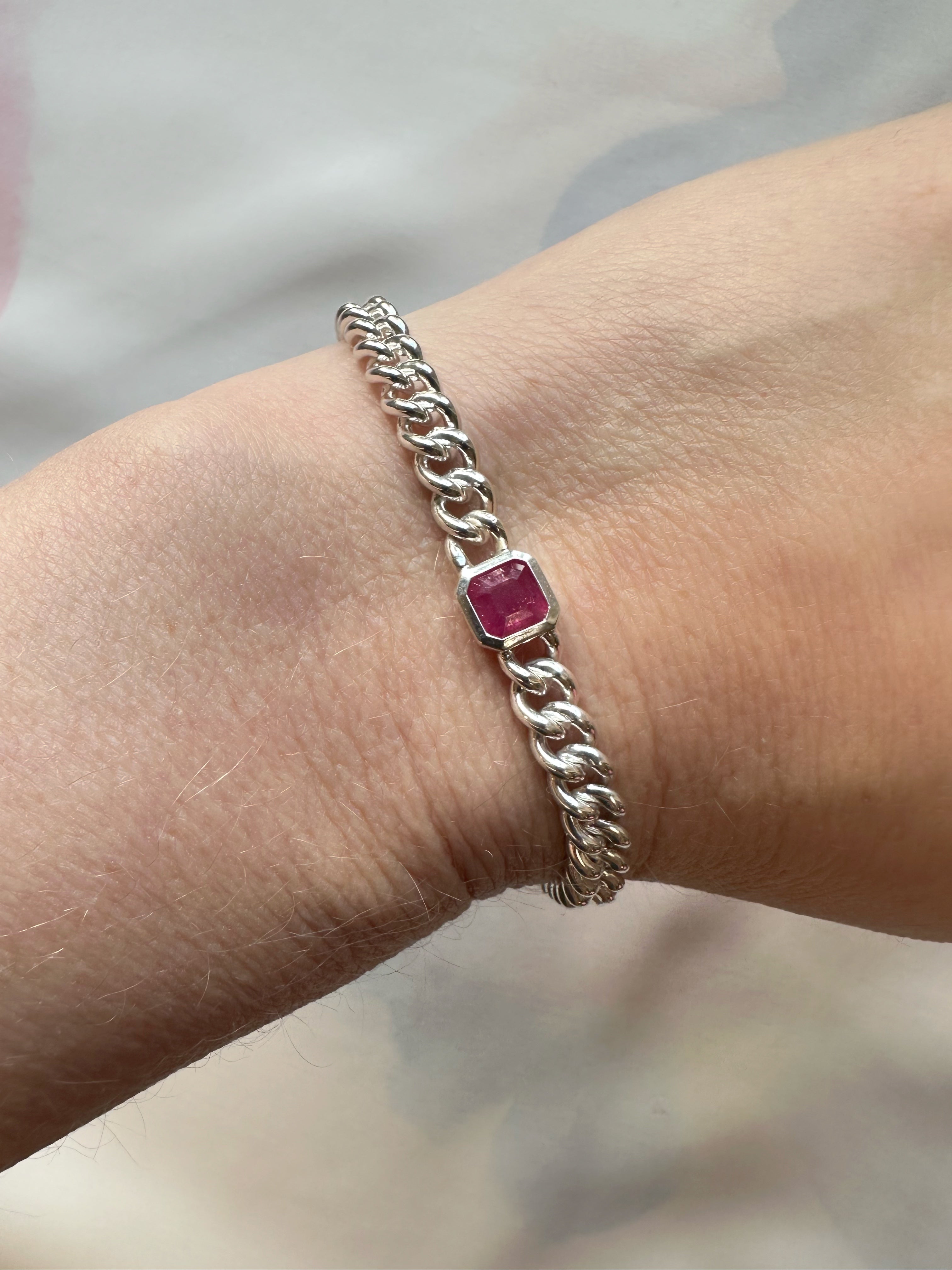 This classic curb chain is made of solid silver (it is not hollow) and finished with a dog clasp, it is ungraduated and the links are 5.4mm wide. The chain was newly made in the UK and we have bezel set the stone with our very pleasing bubble back setting.