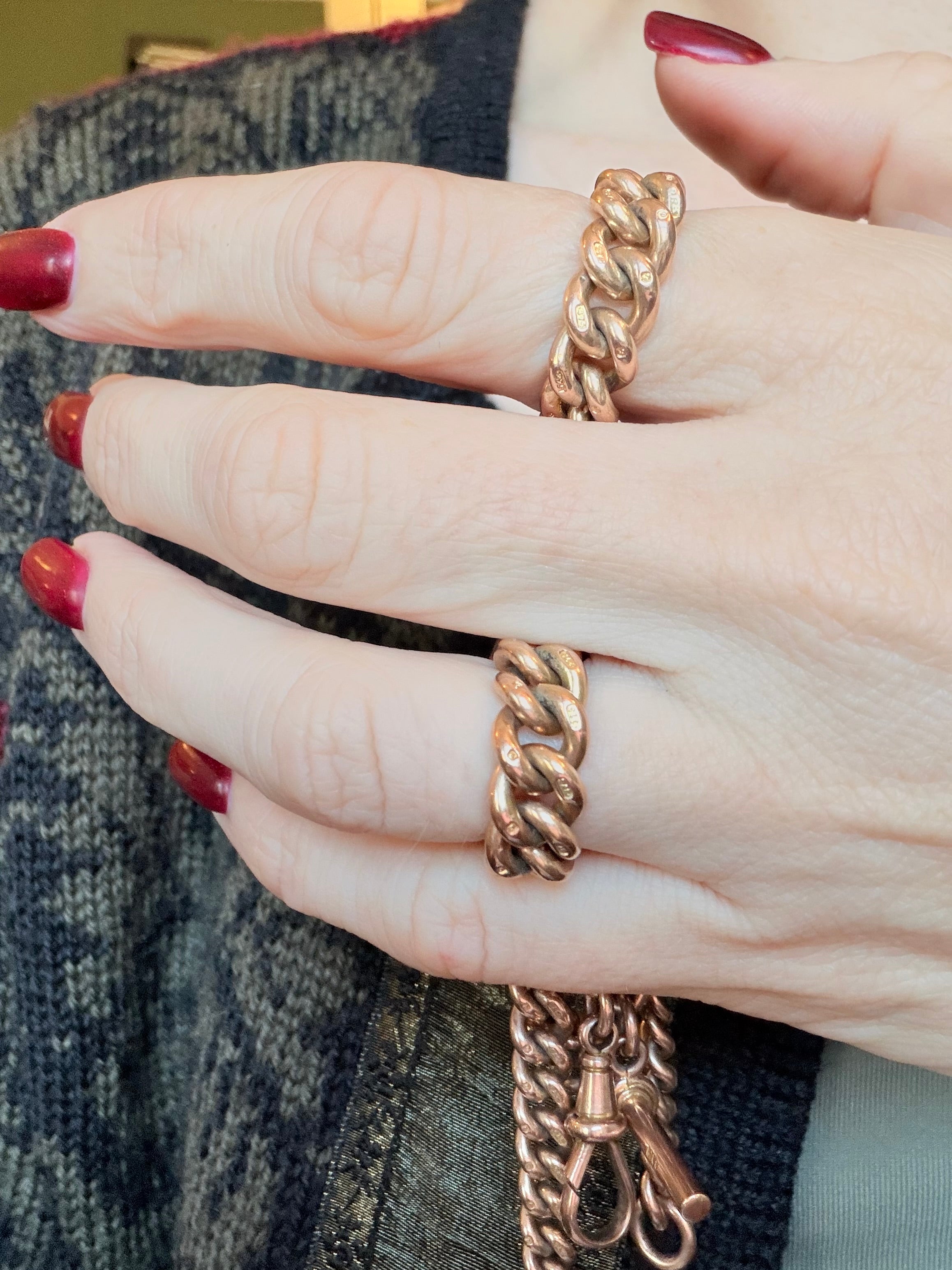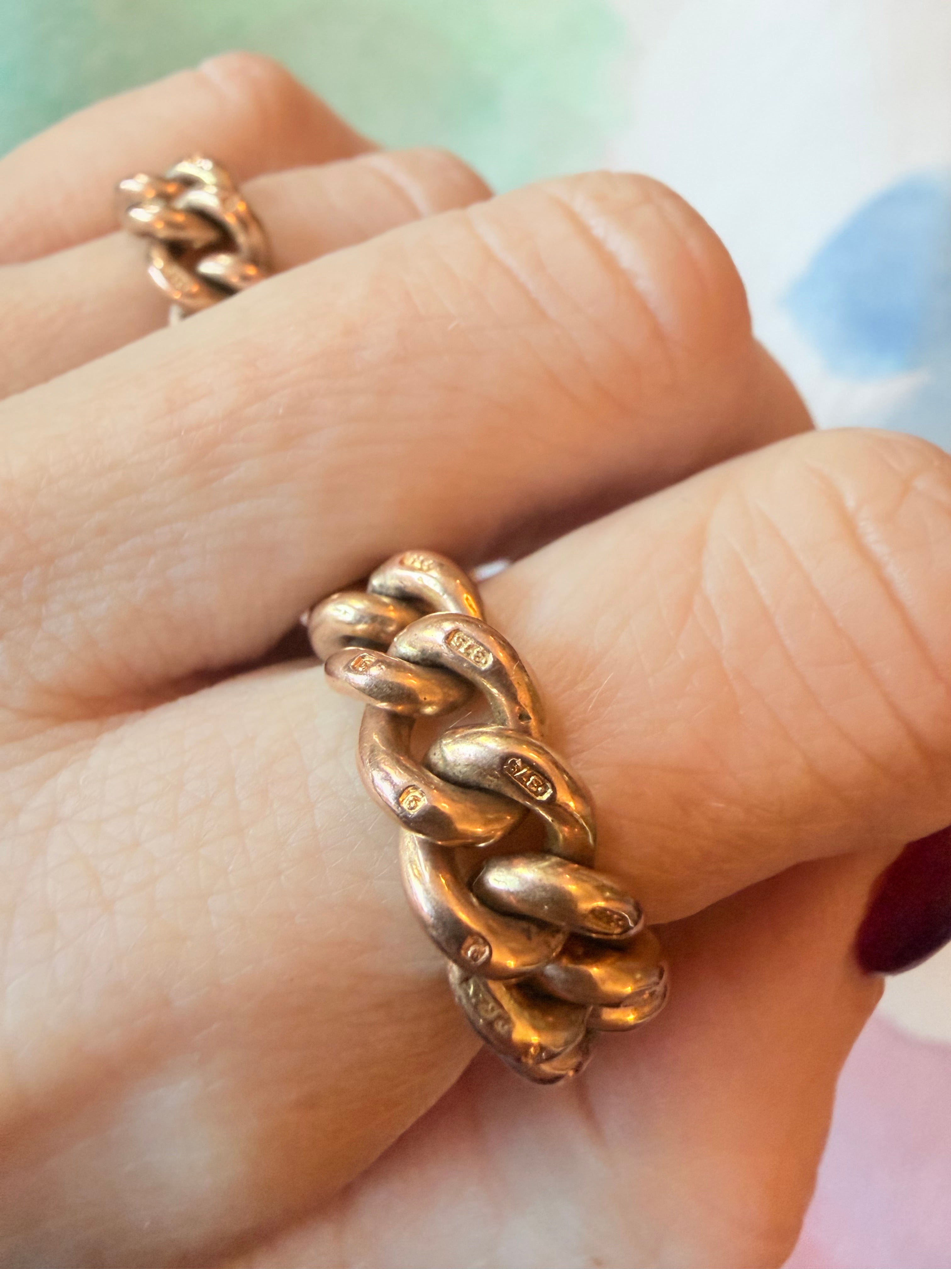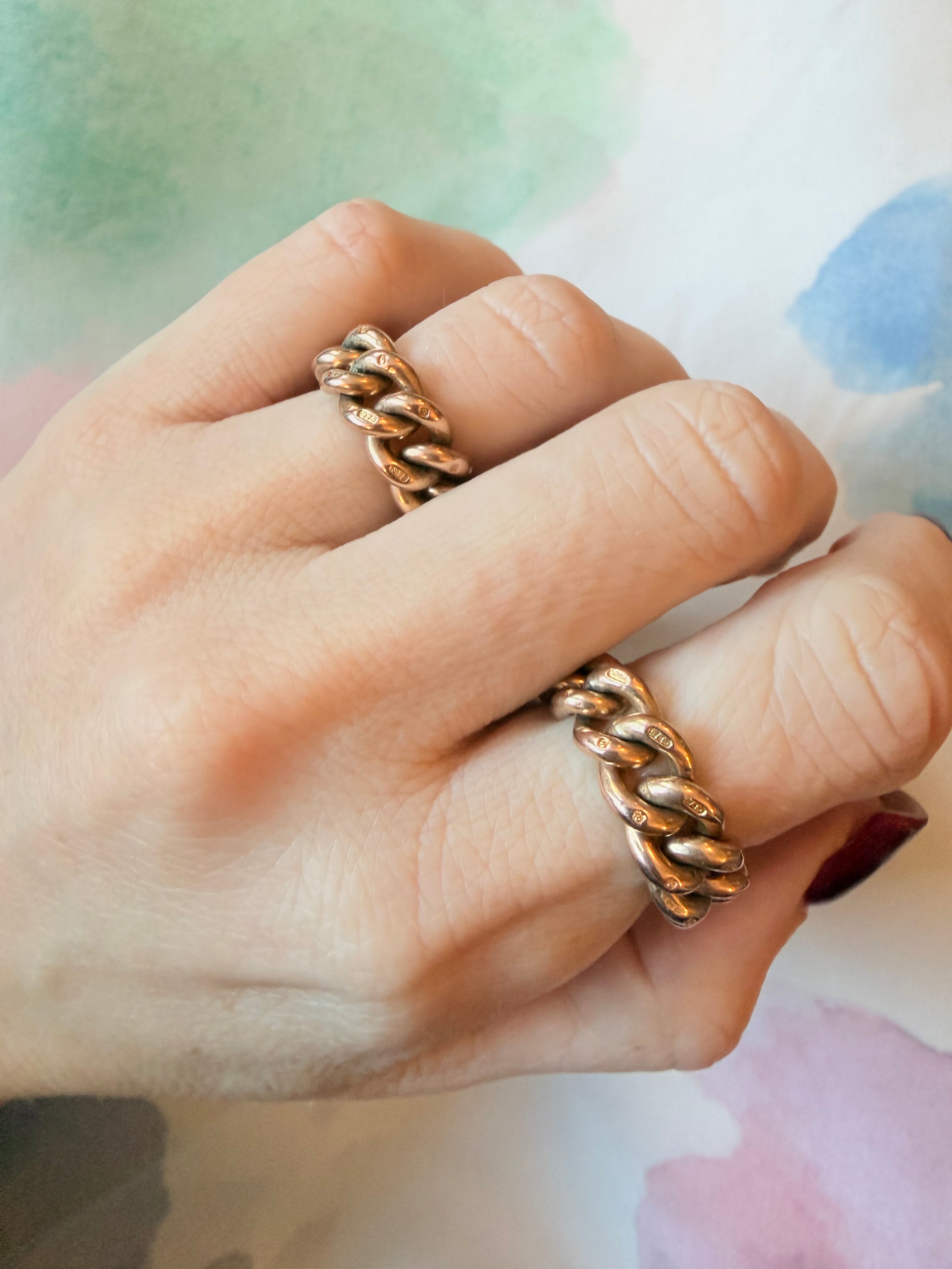Your chance to have a chunky chain ring made in your size! Made from the central section of an antique watch chain, the widest link is 8.2mm wide and they will taper down to approx 7.5mm (depending on size).