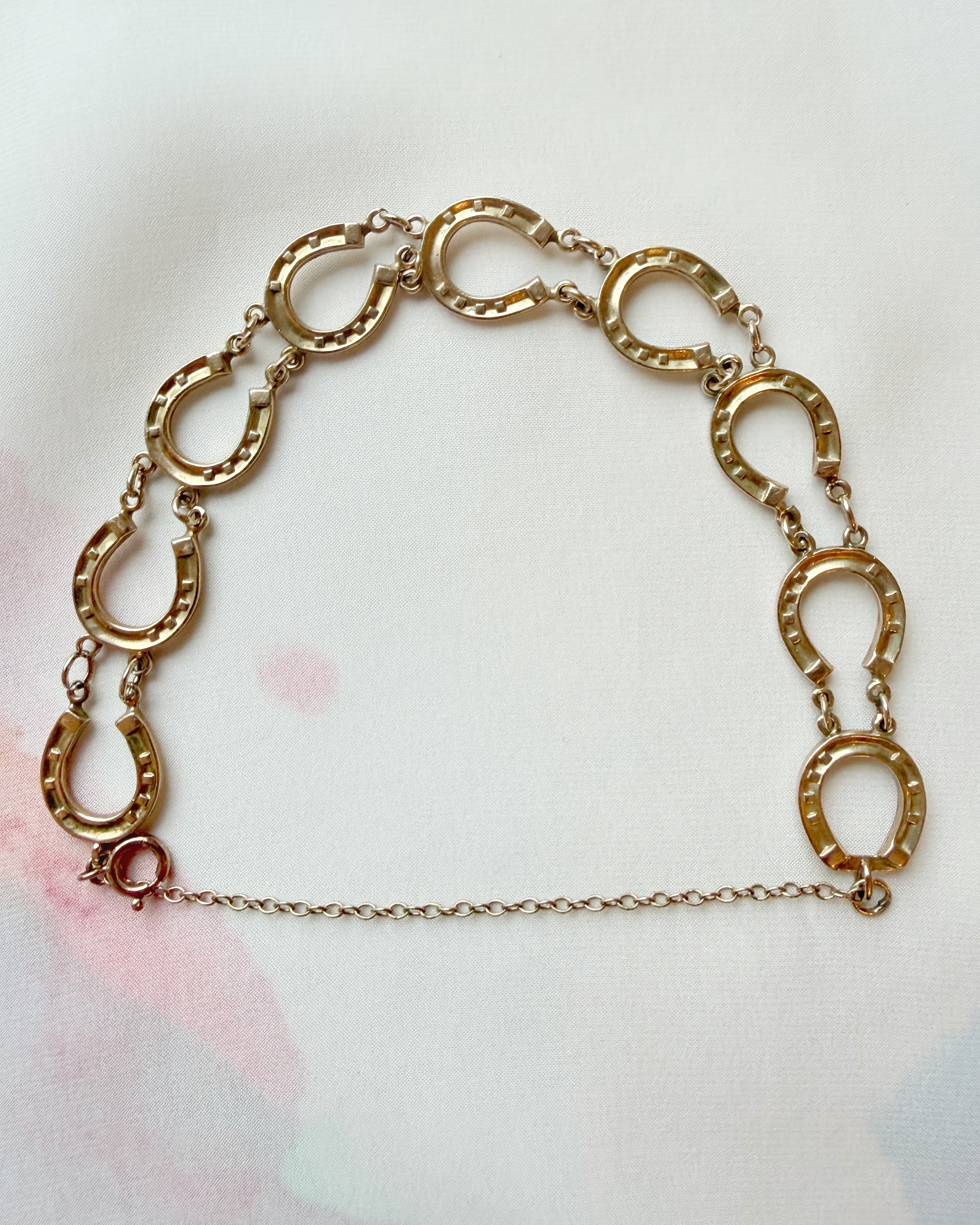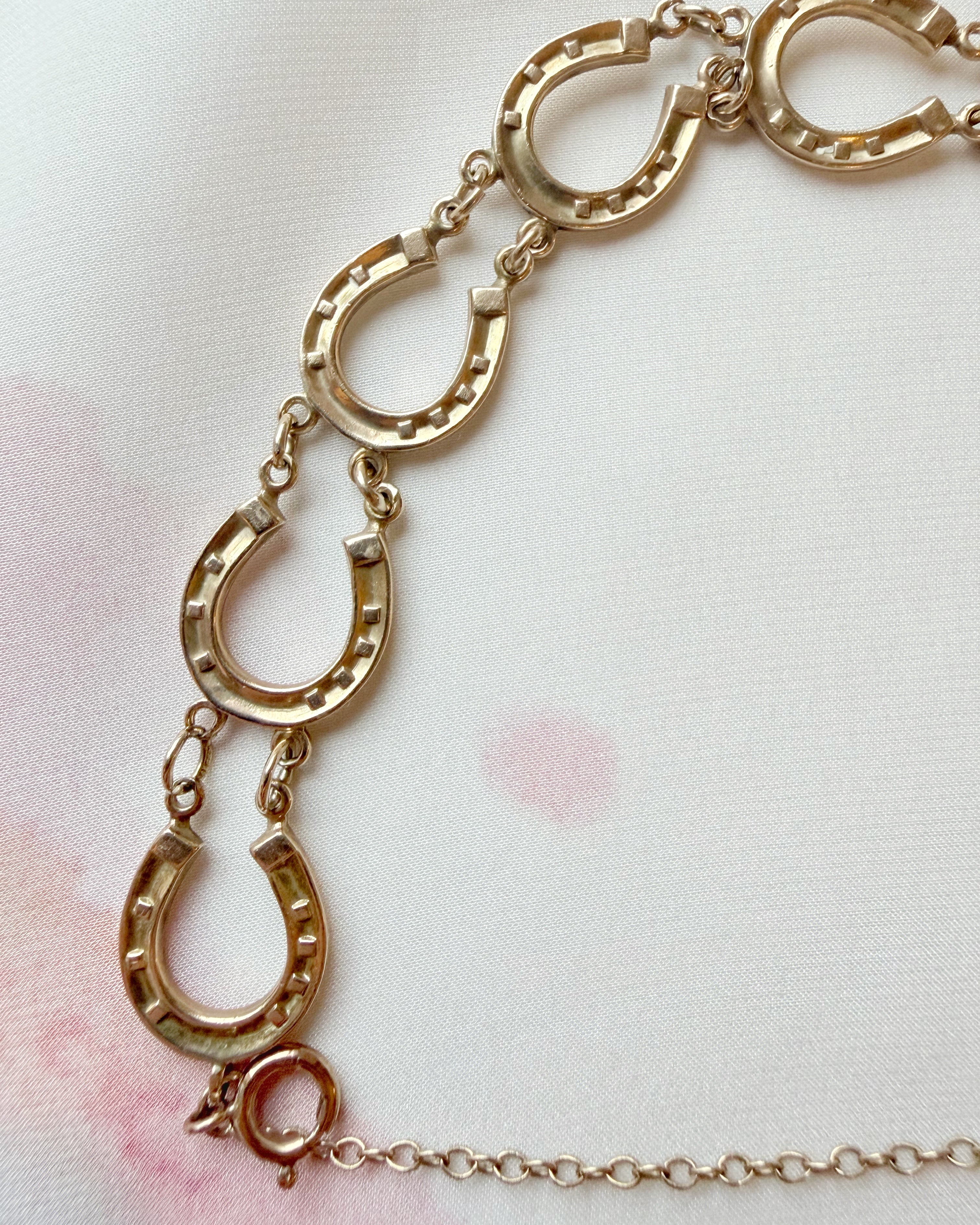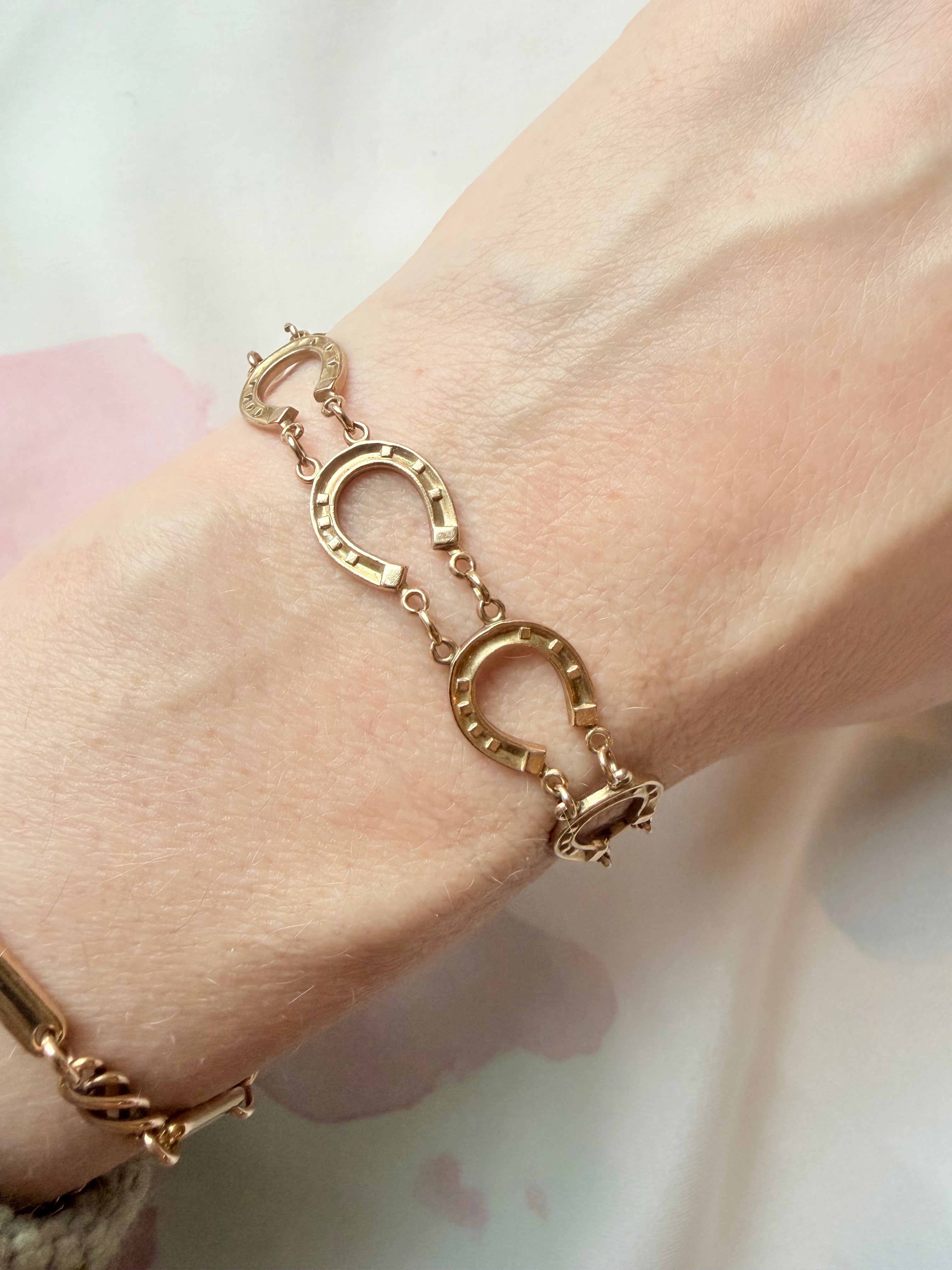 A really lovely piece - with a date mark for 1924 and '9 .375' stamps to the reverse of several of the padlocks, this horseshoe bracelet is a fun and wearable antique piece.