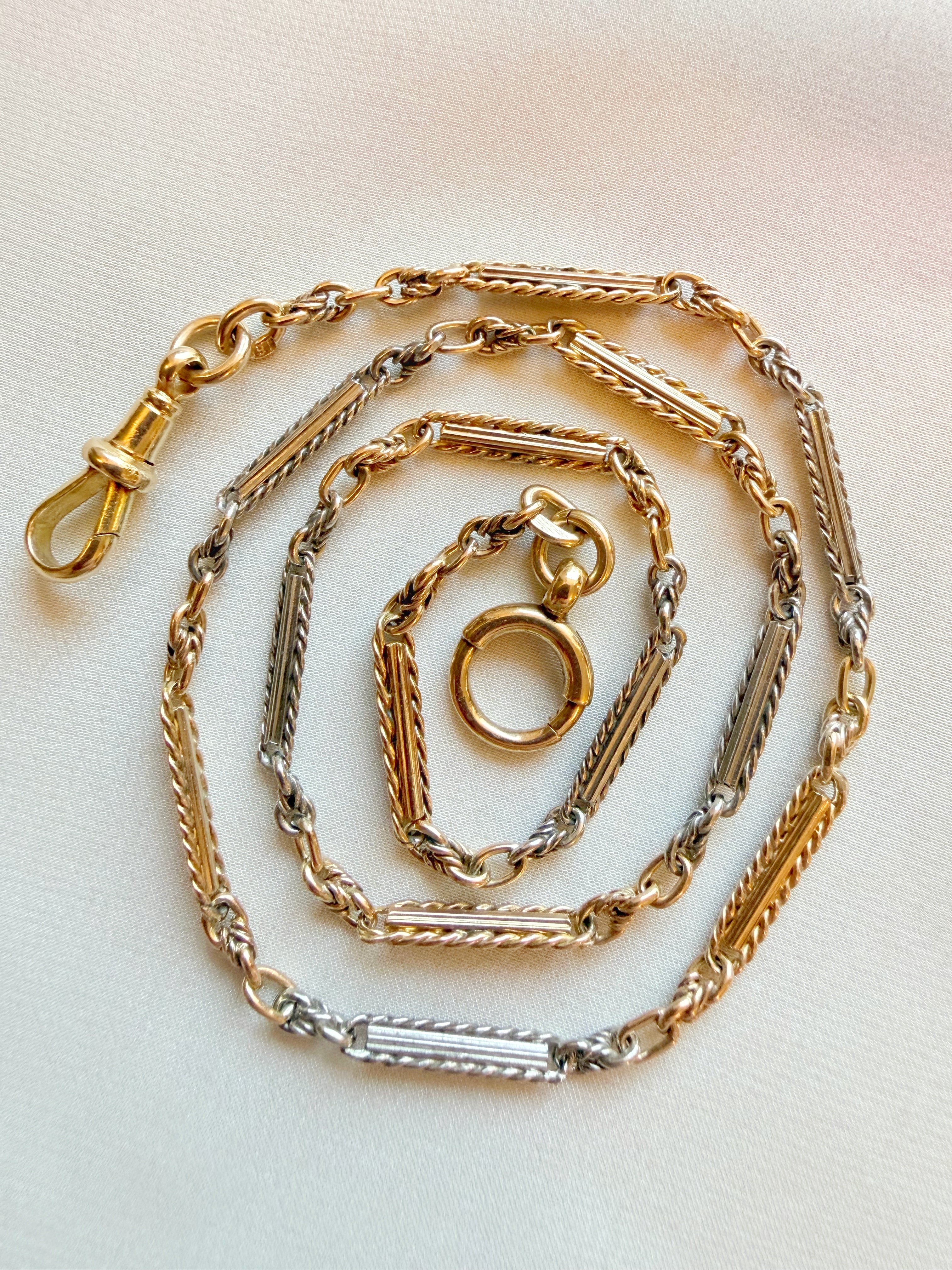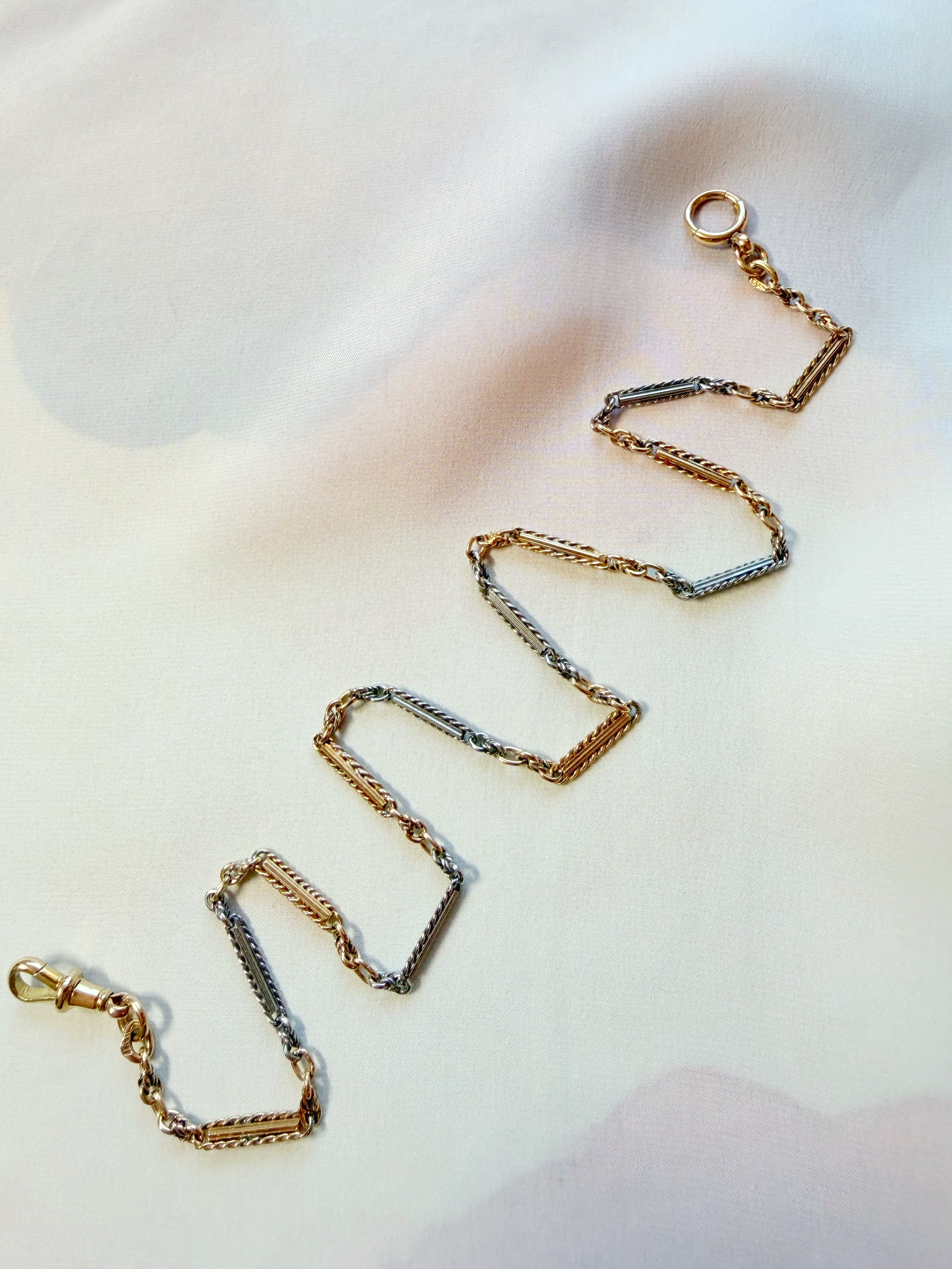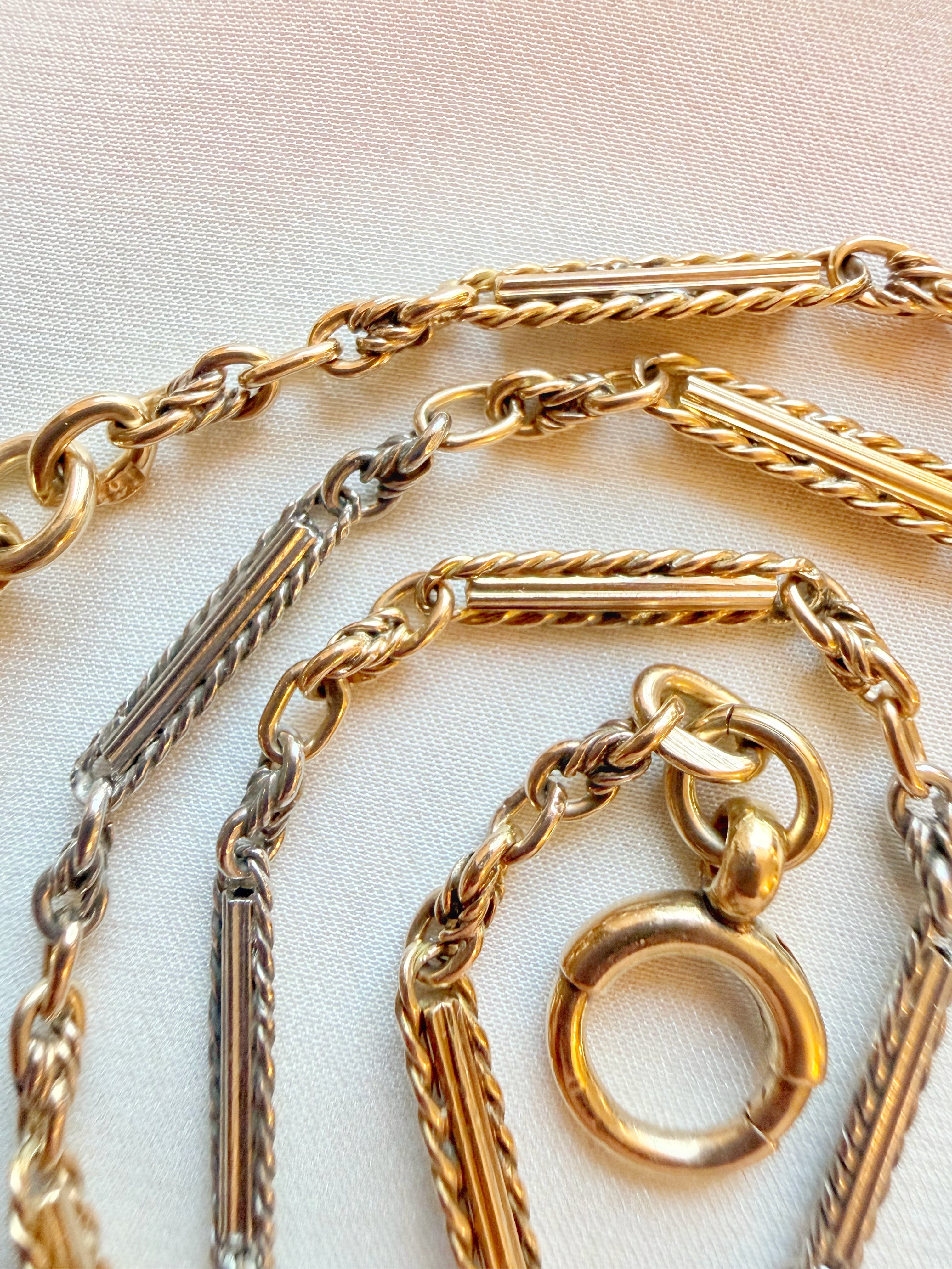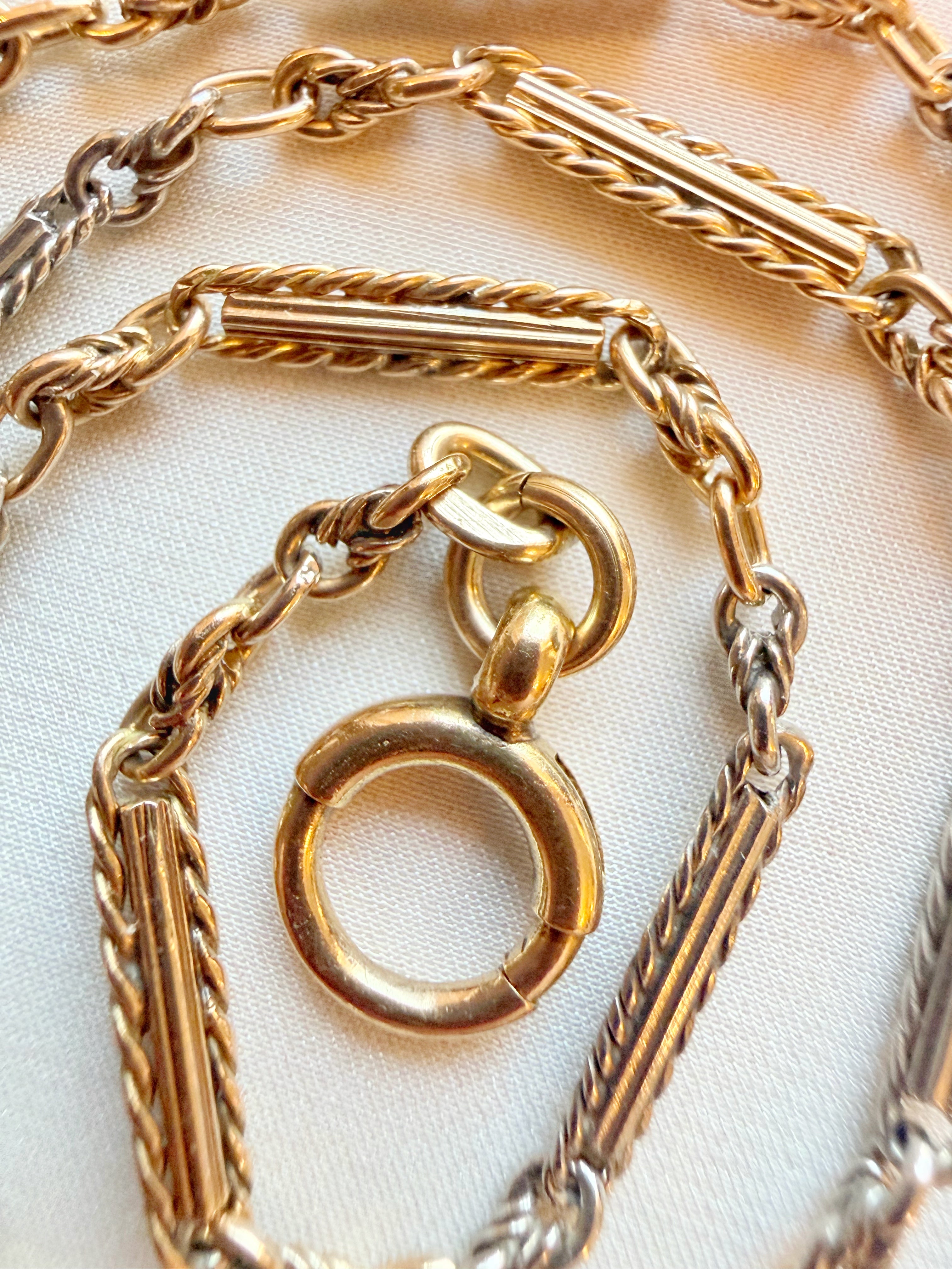 A stunning antique staple, with 18ct clasps and the chain itself made from 14ct gold and platinum lovers knot & fancy twisted paperclip links.