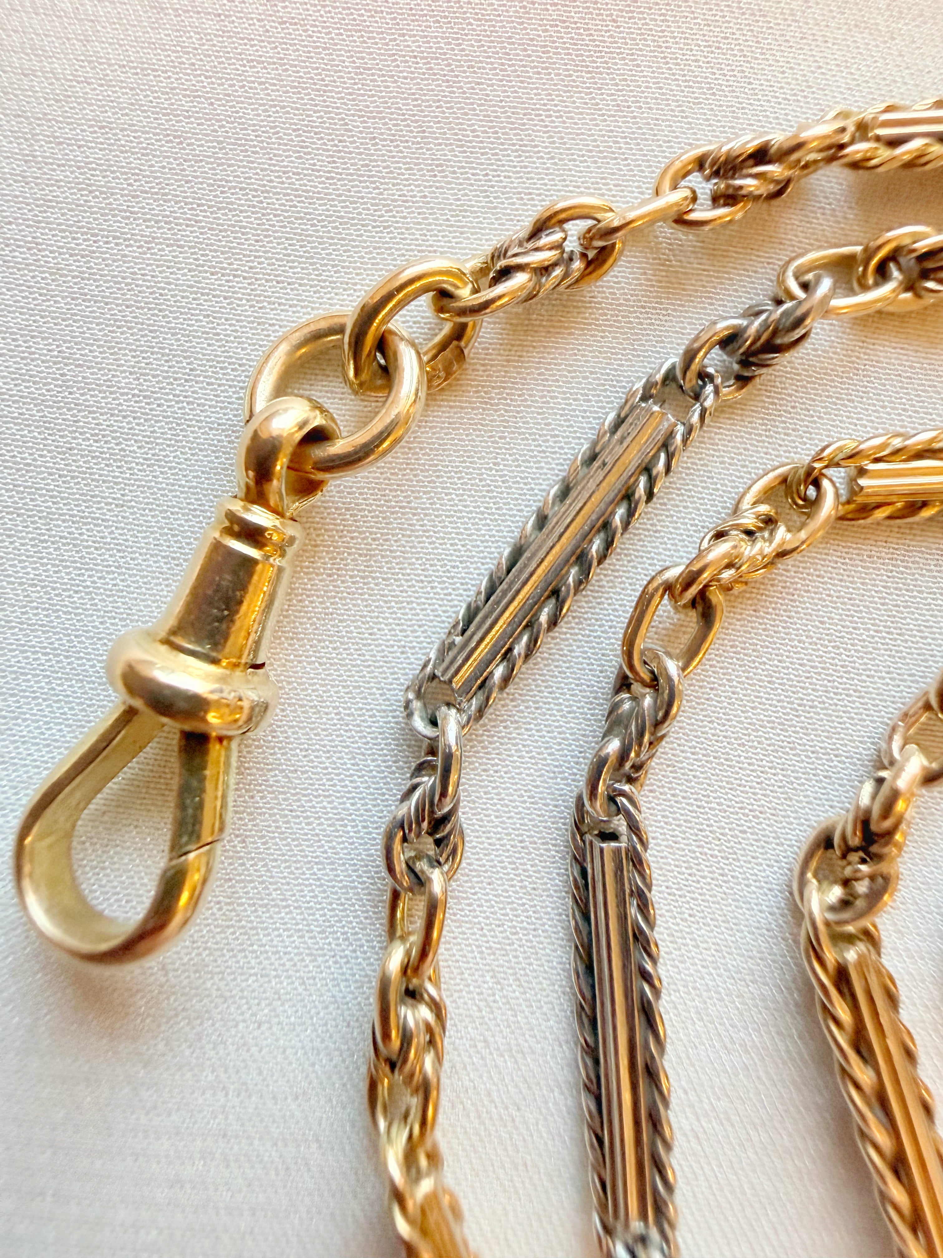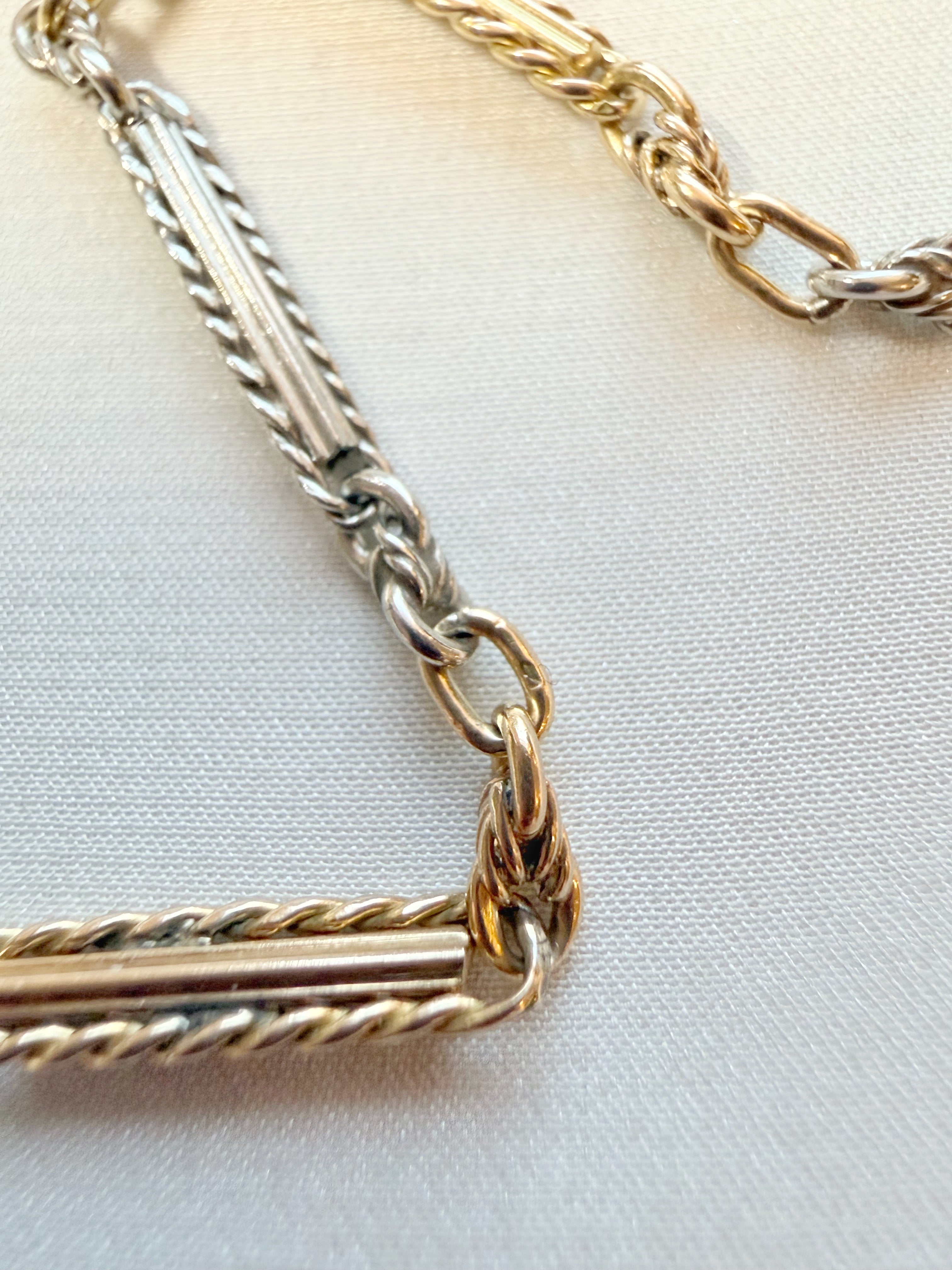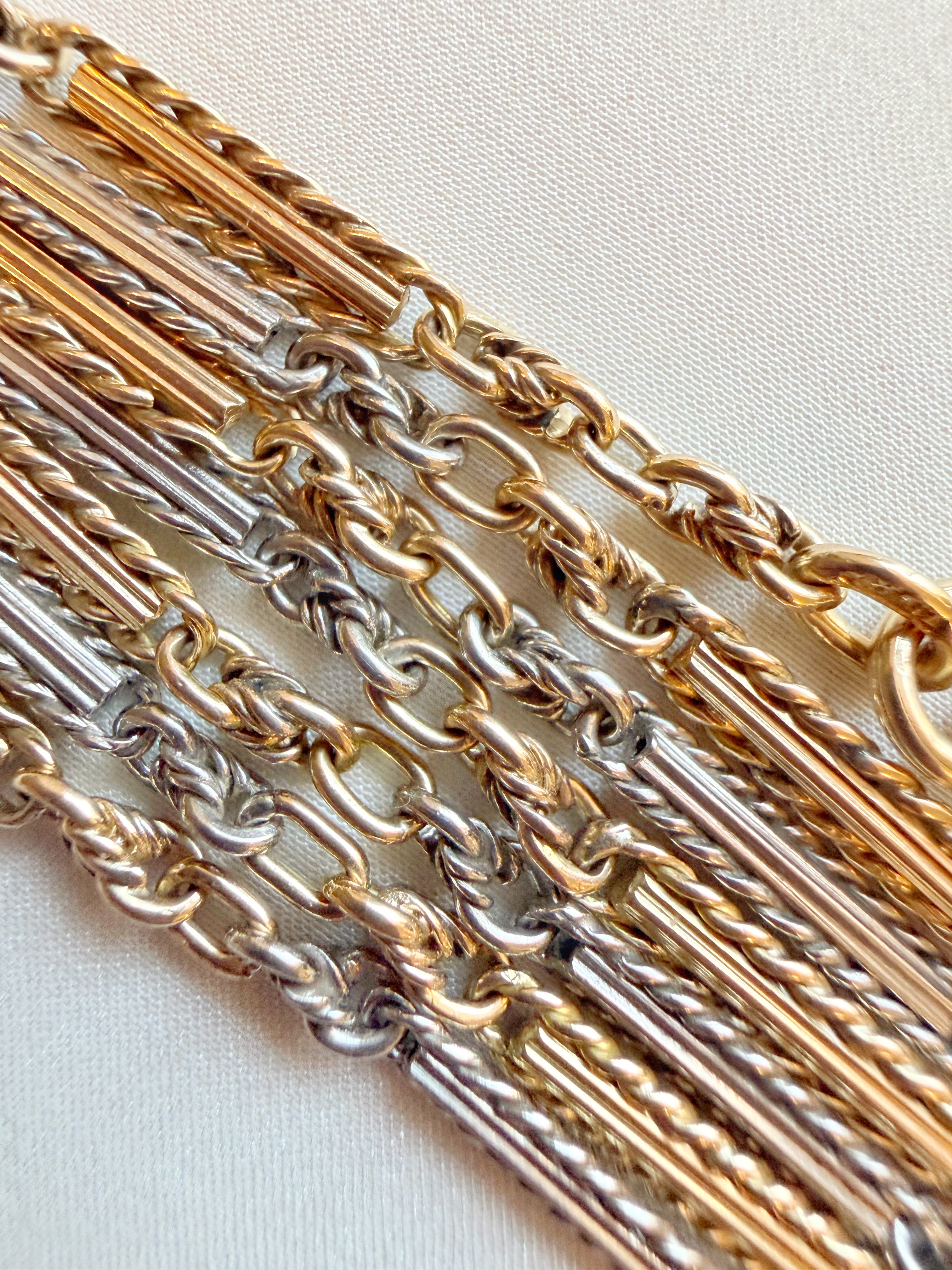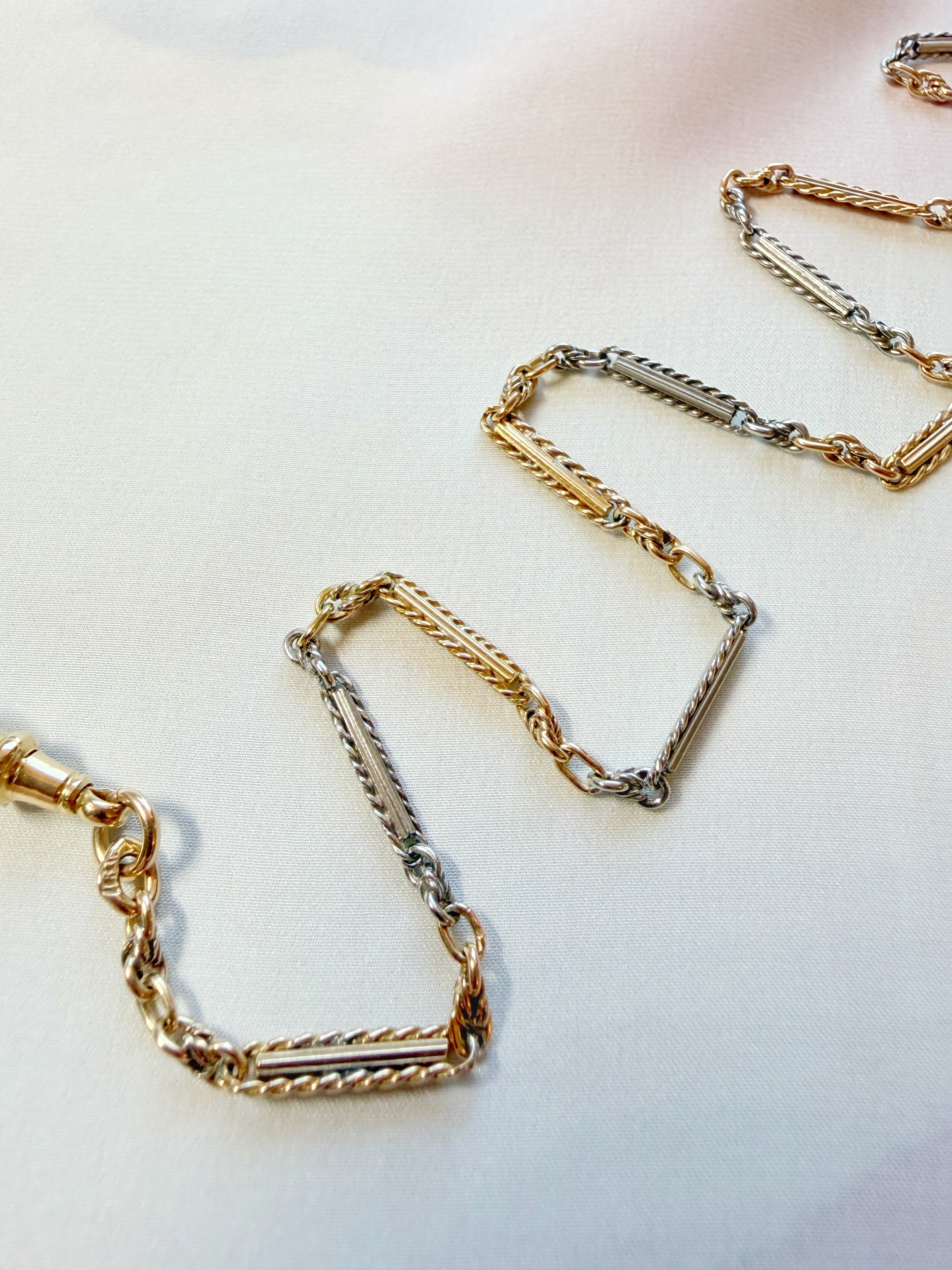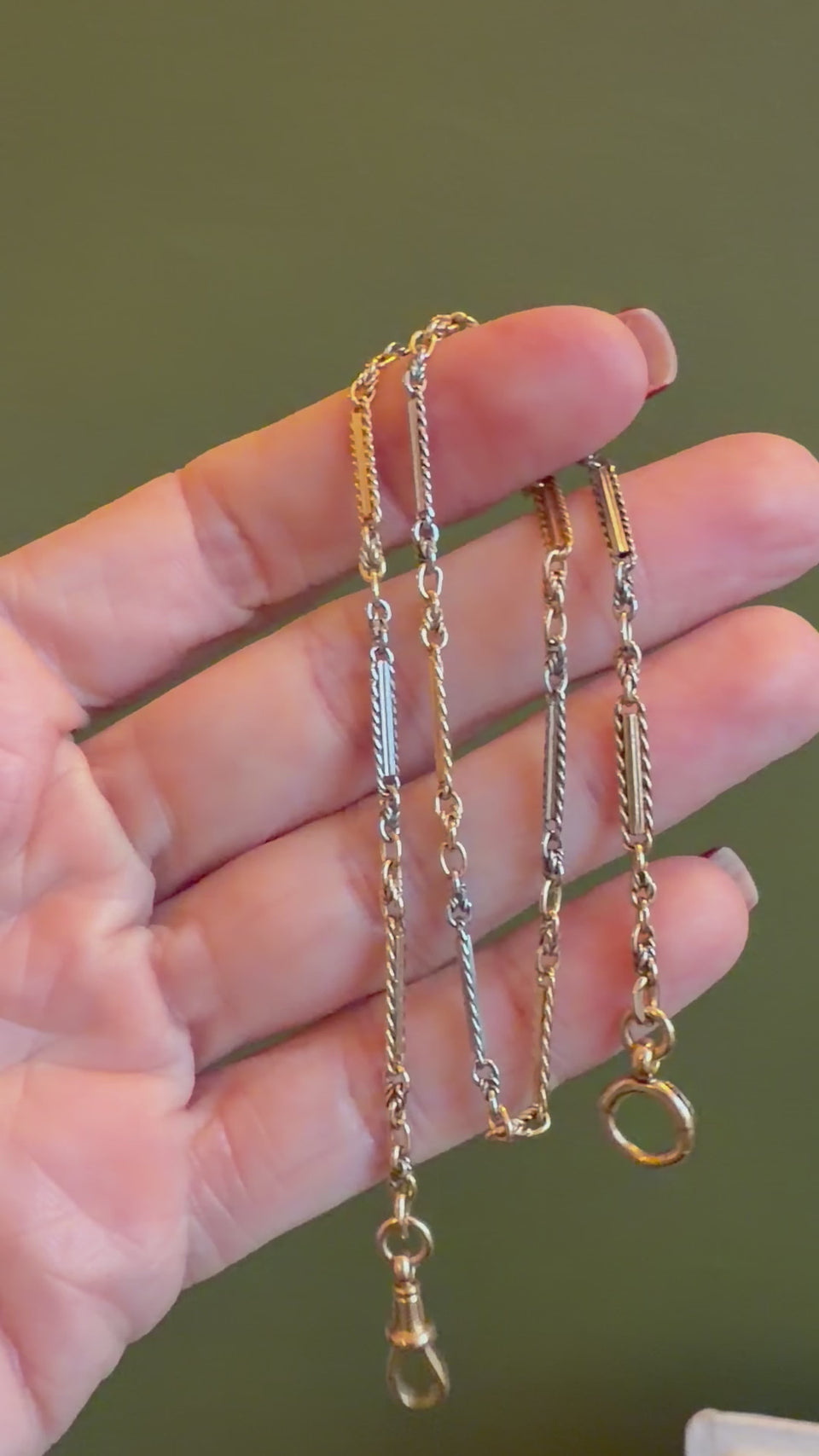 A stunning antique staple, with 18ct clasps and the chain itself made from 14ct gold and platinum lovers knot & fancy twisted paperclip links.