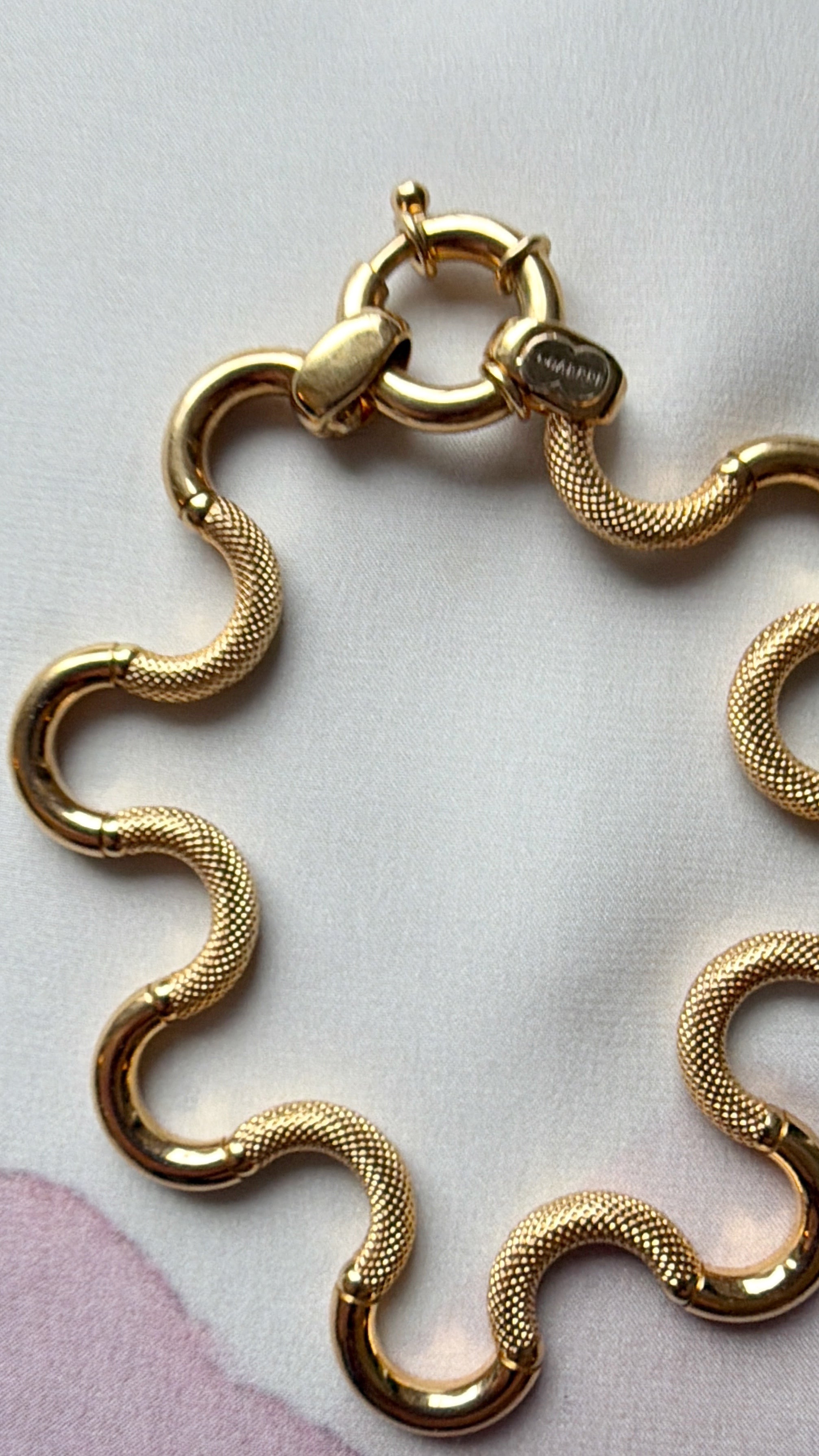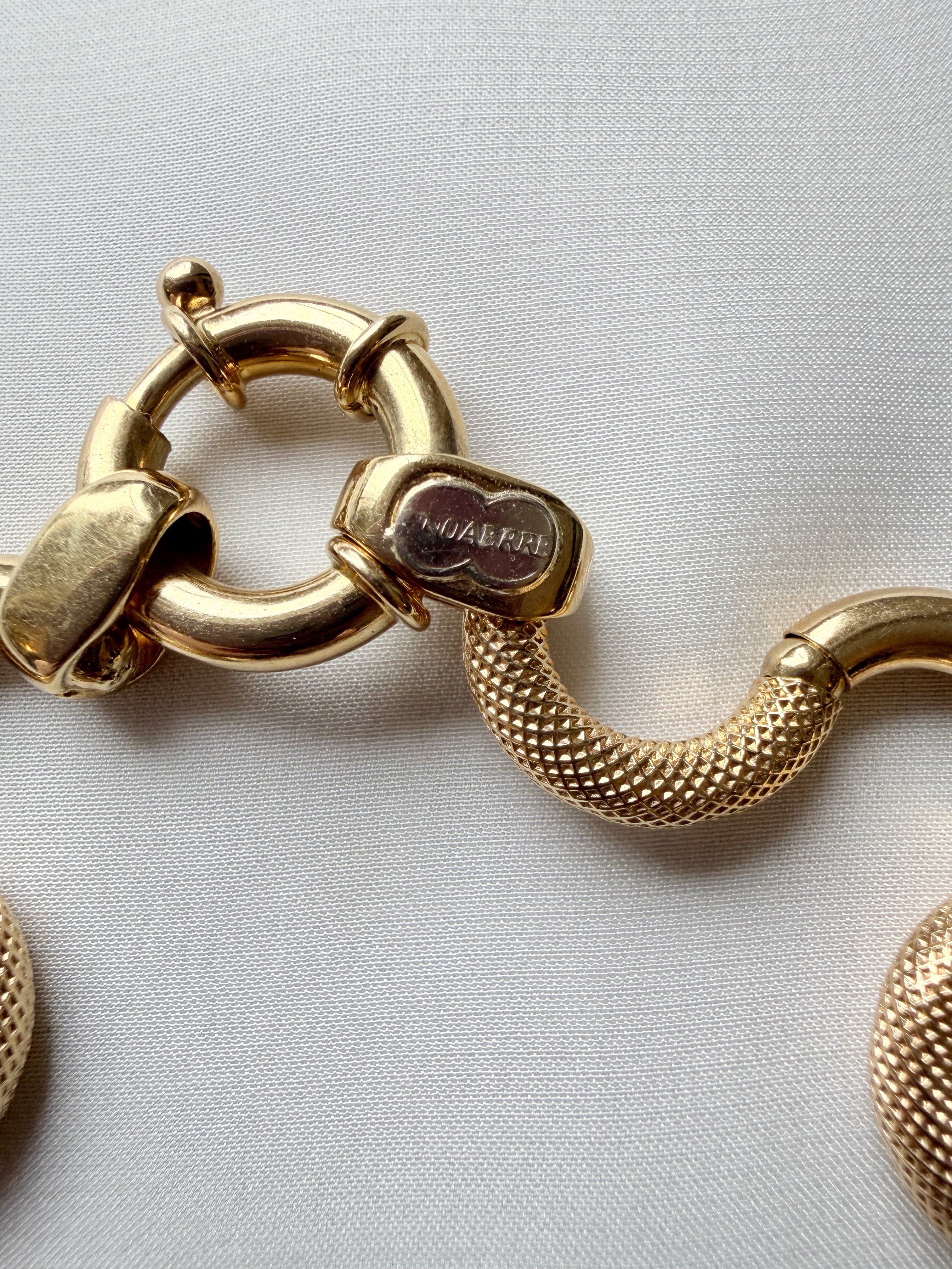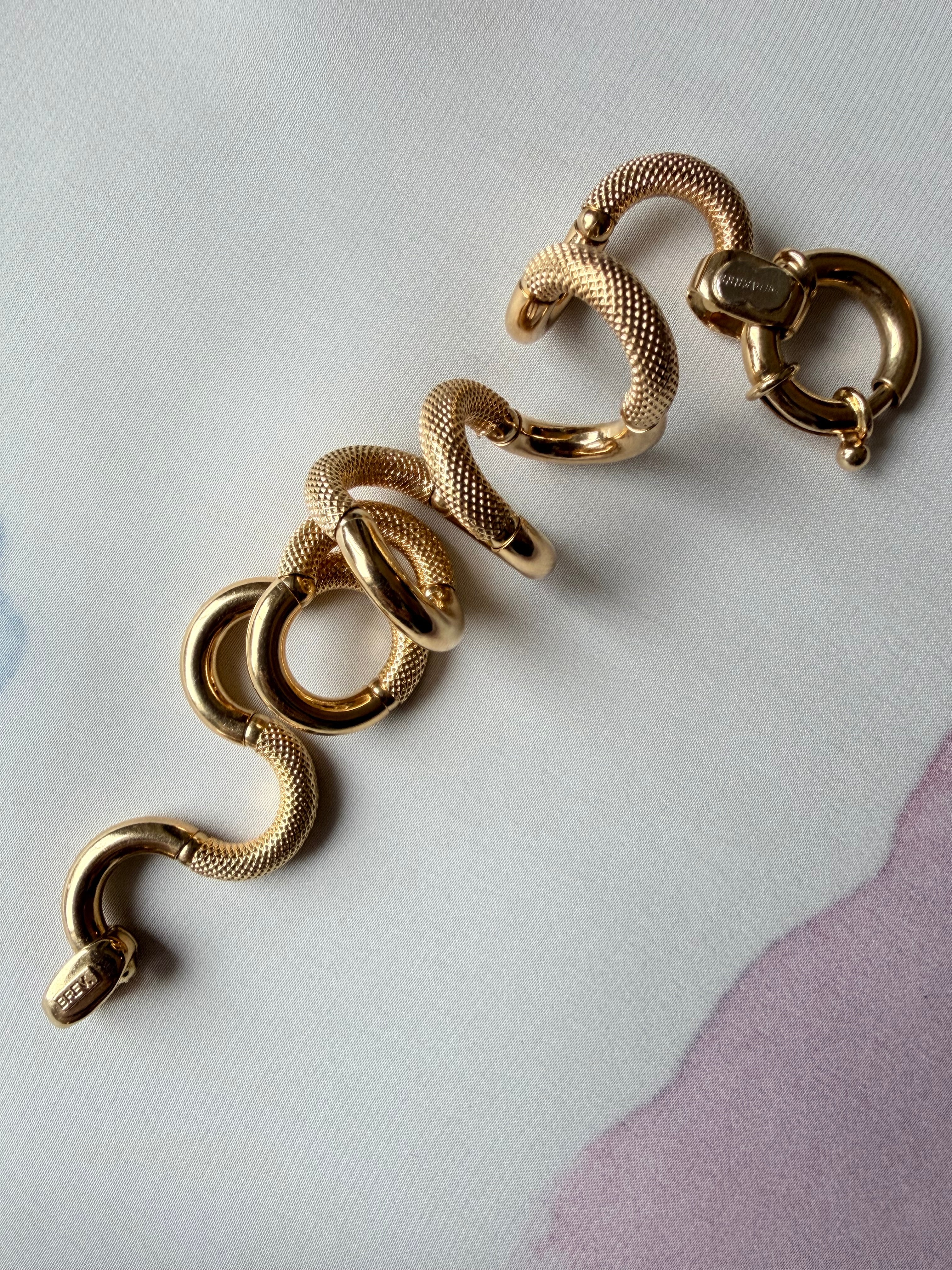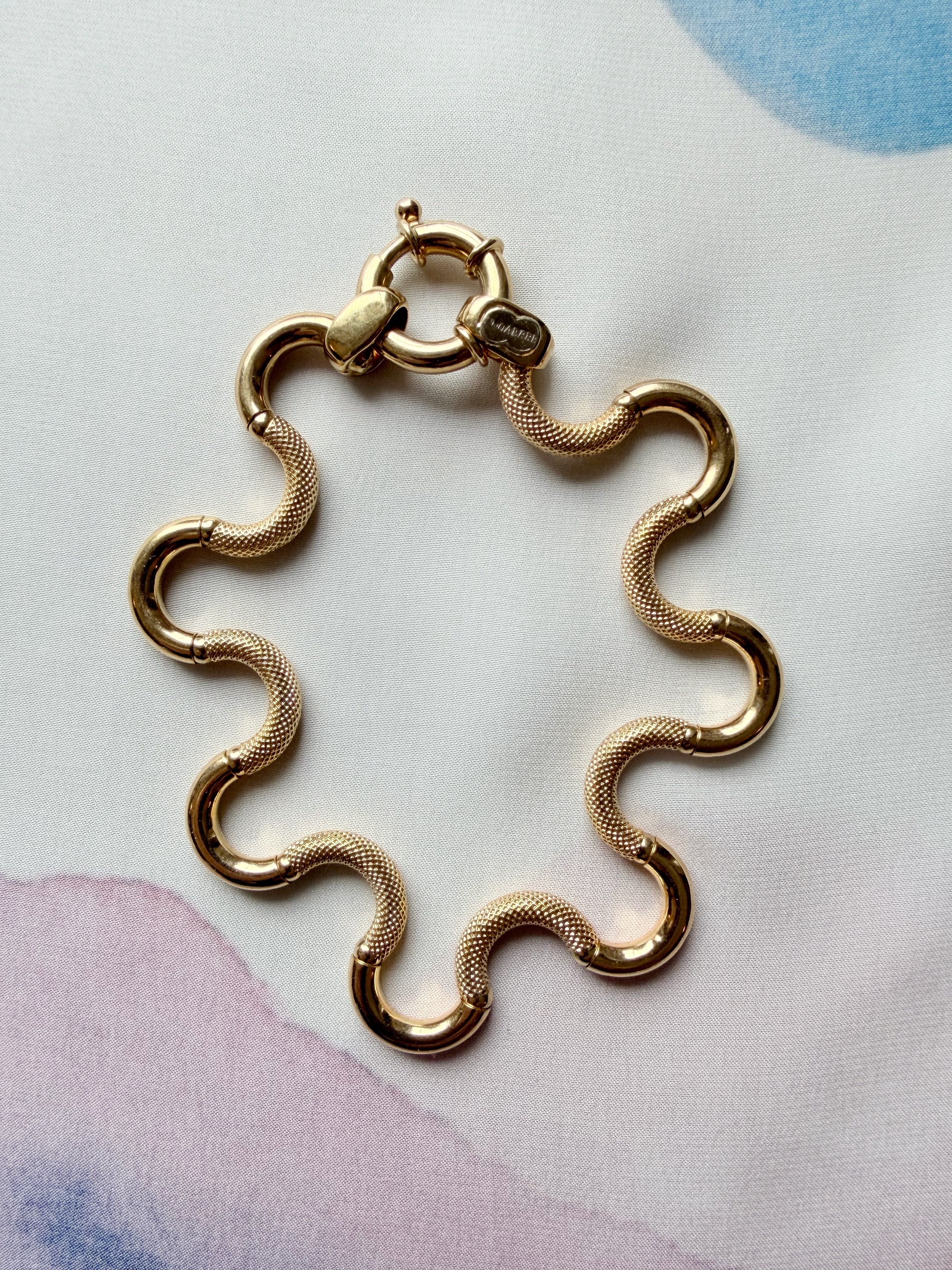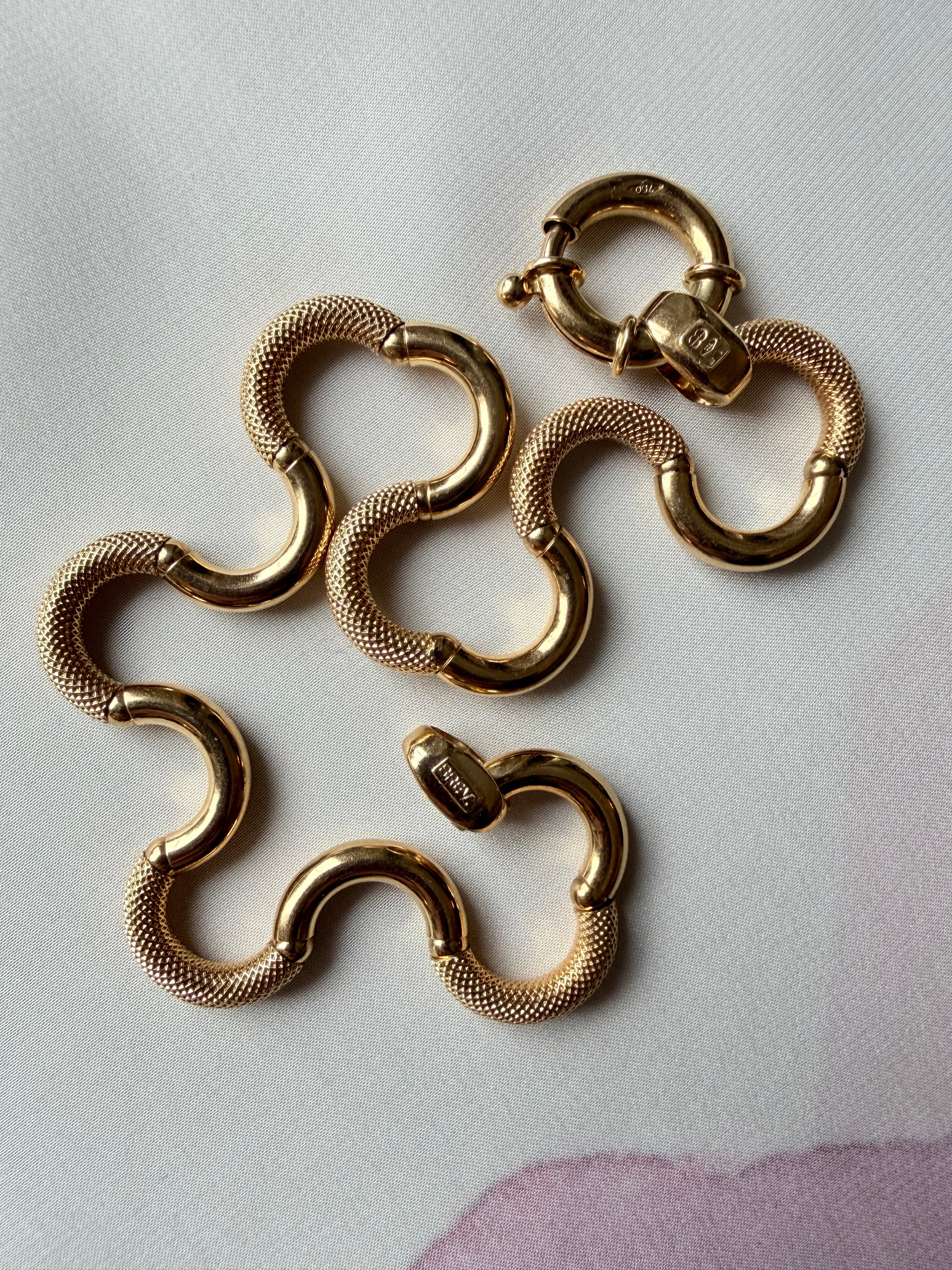 The result is a fluid appearance and hugely tactile piece of jewellery, perfectly finished with a chubby bolt clasp, hallmarked in Italy for 18ct gold and with the UnoAErre makers tag applied in white gold to the end link.