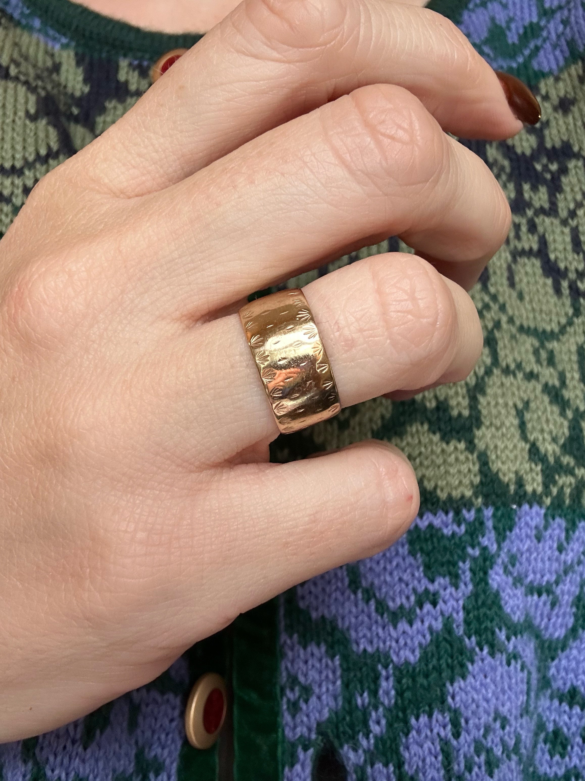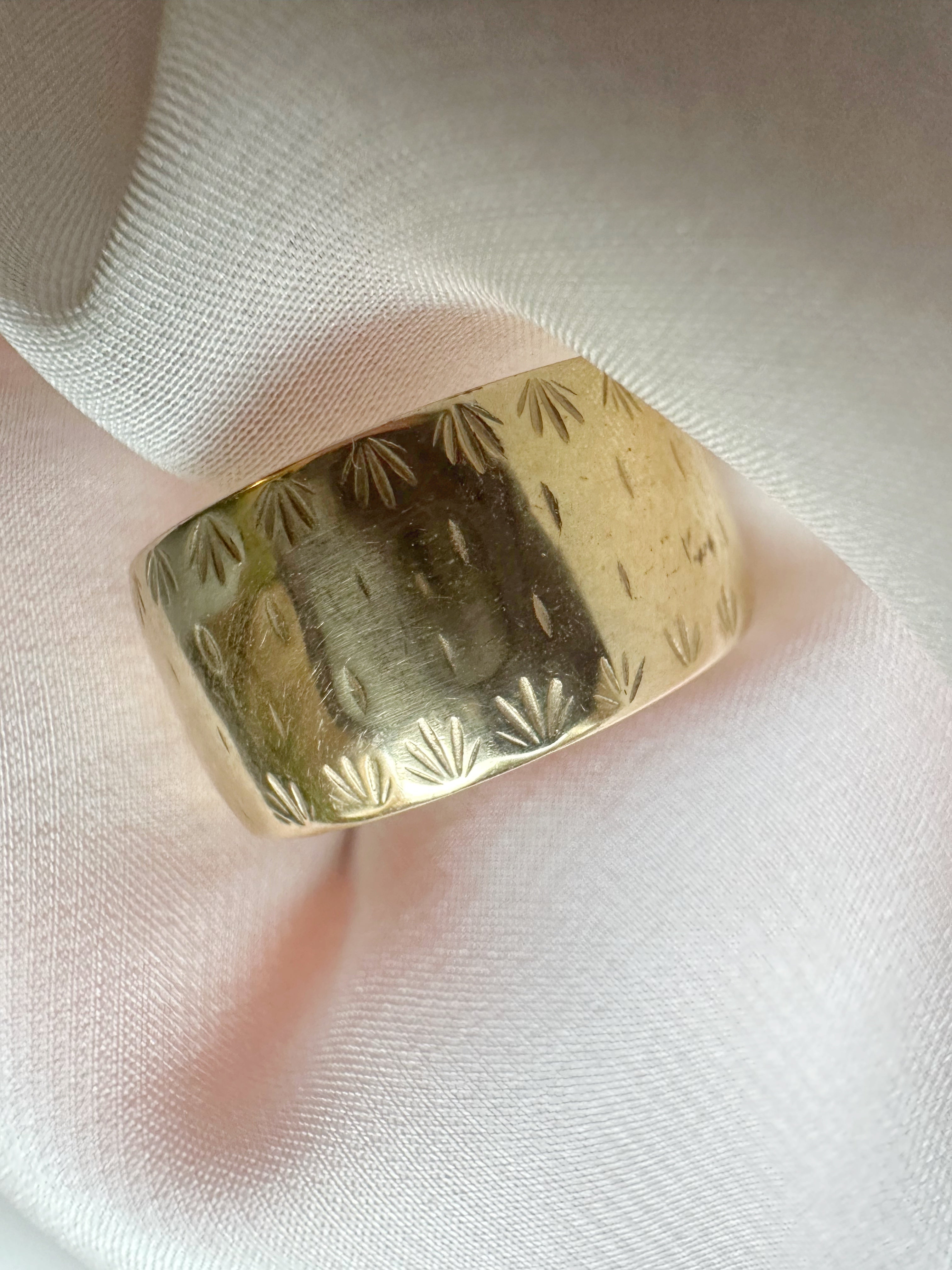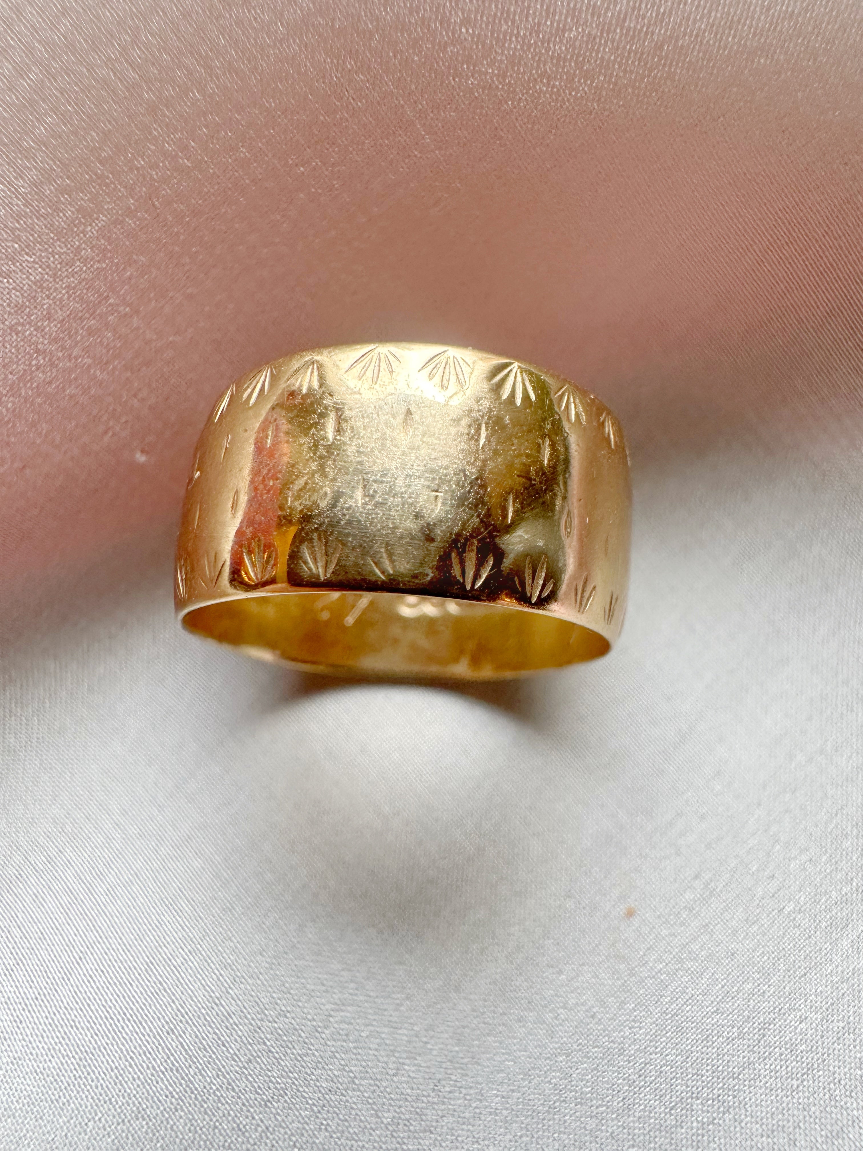 At 8.7mm wide this piece, made from yellow gold, is full of character. There are delicate engravings to the centre of the band which have mostly worn from one half of the ring, but are visible on the other side.