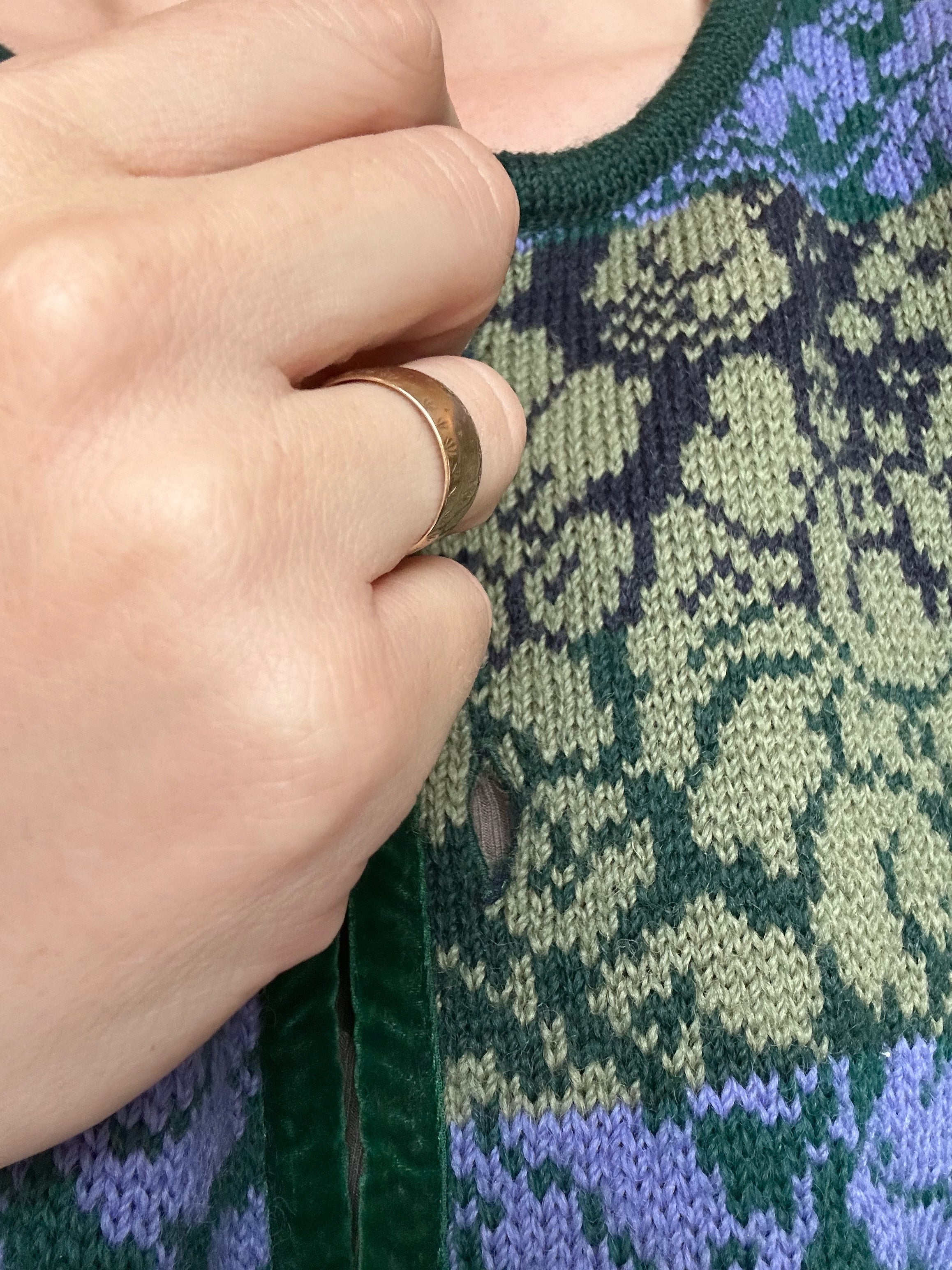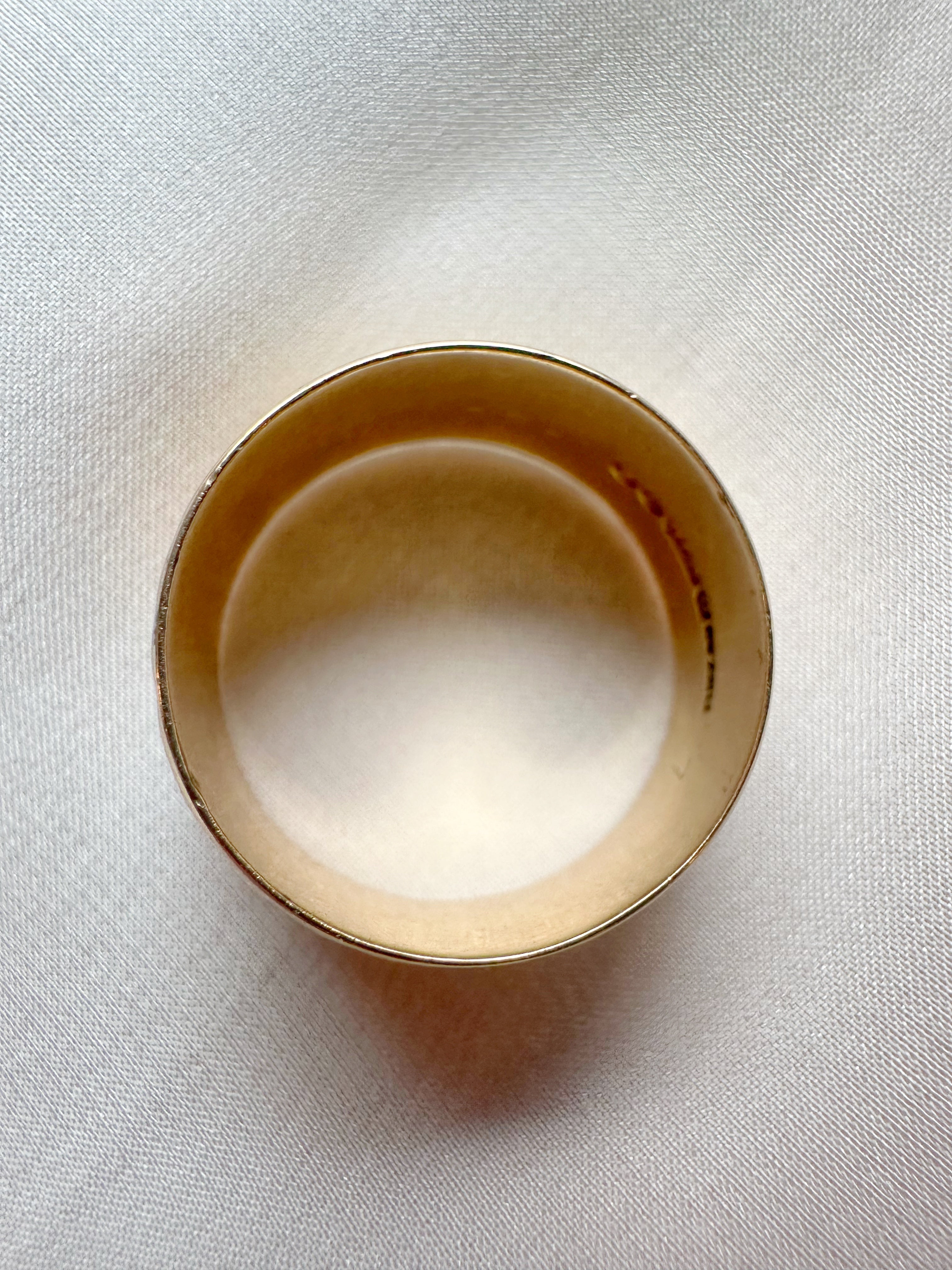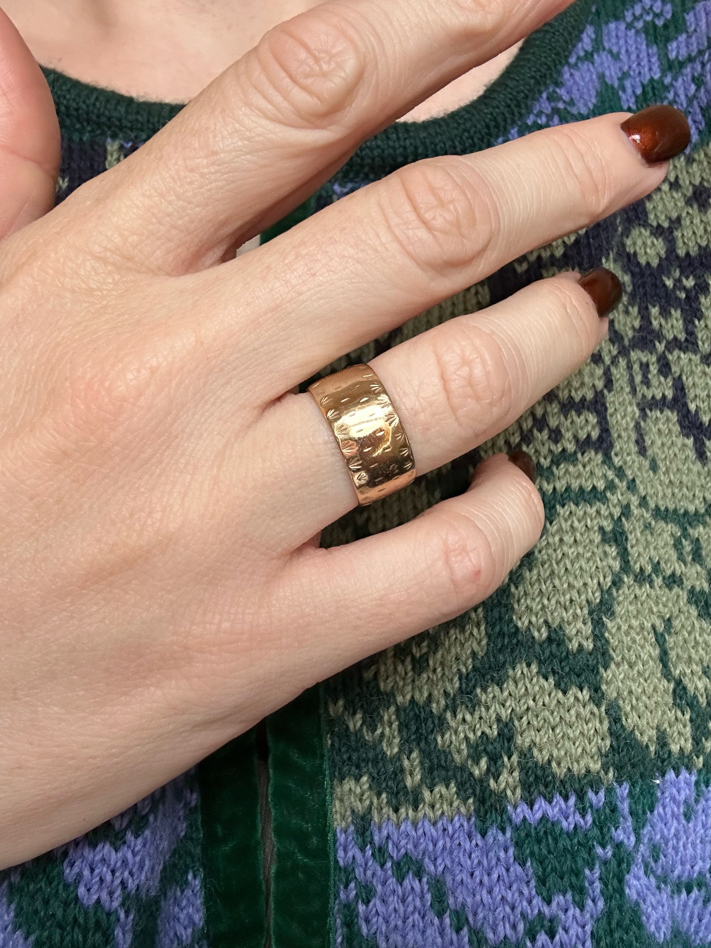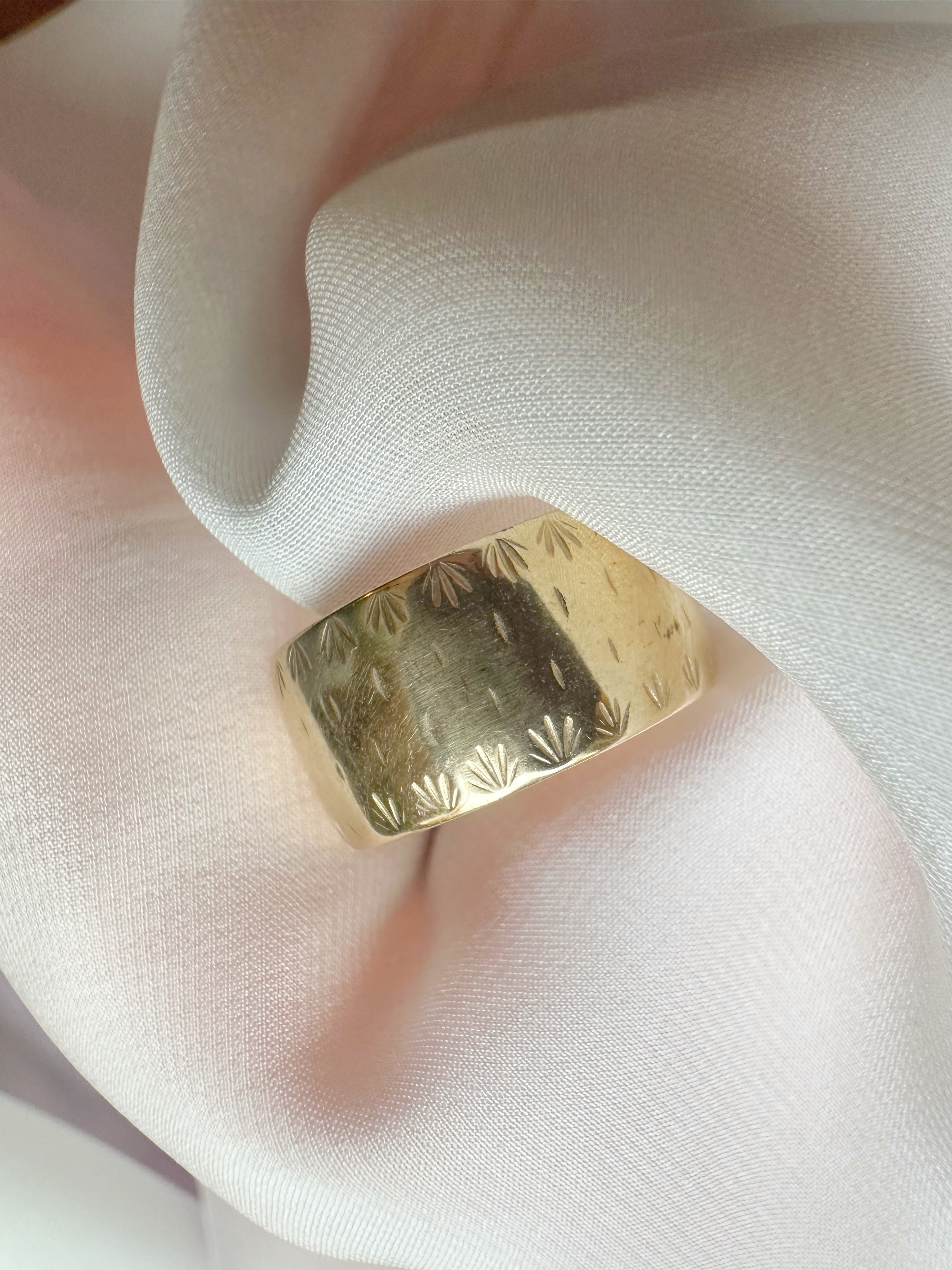 At 8.7mm wide this piece, made from yellow gold, is full of character. There are delicate engravings to the centre of the band which have mostly worn from one half of the ring, but are visible on the other side.