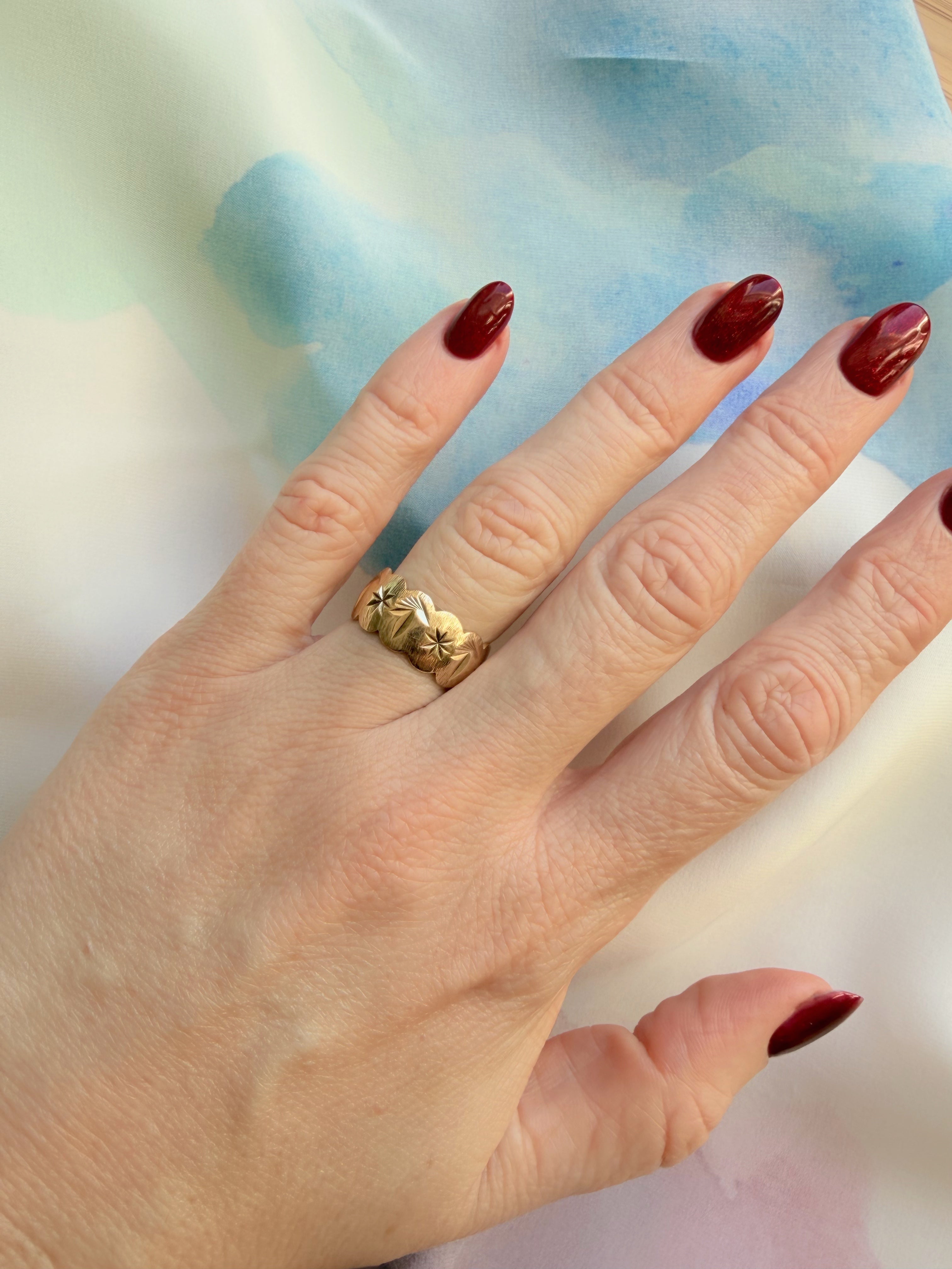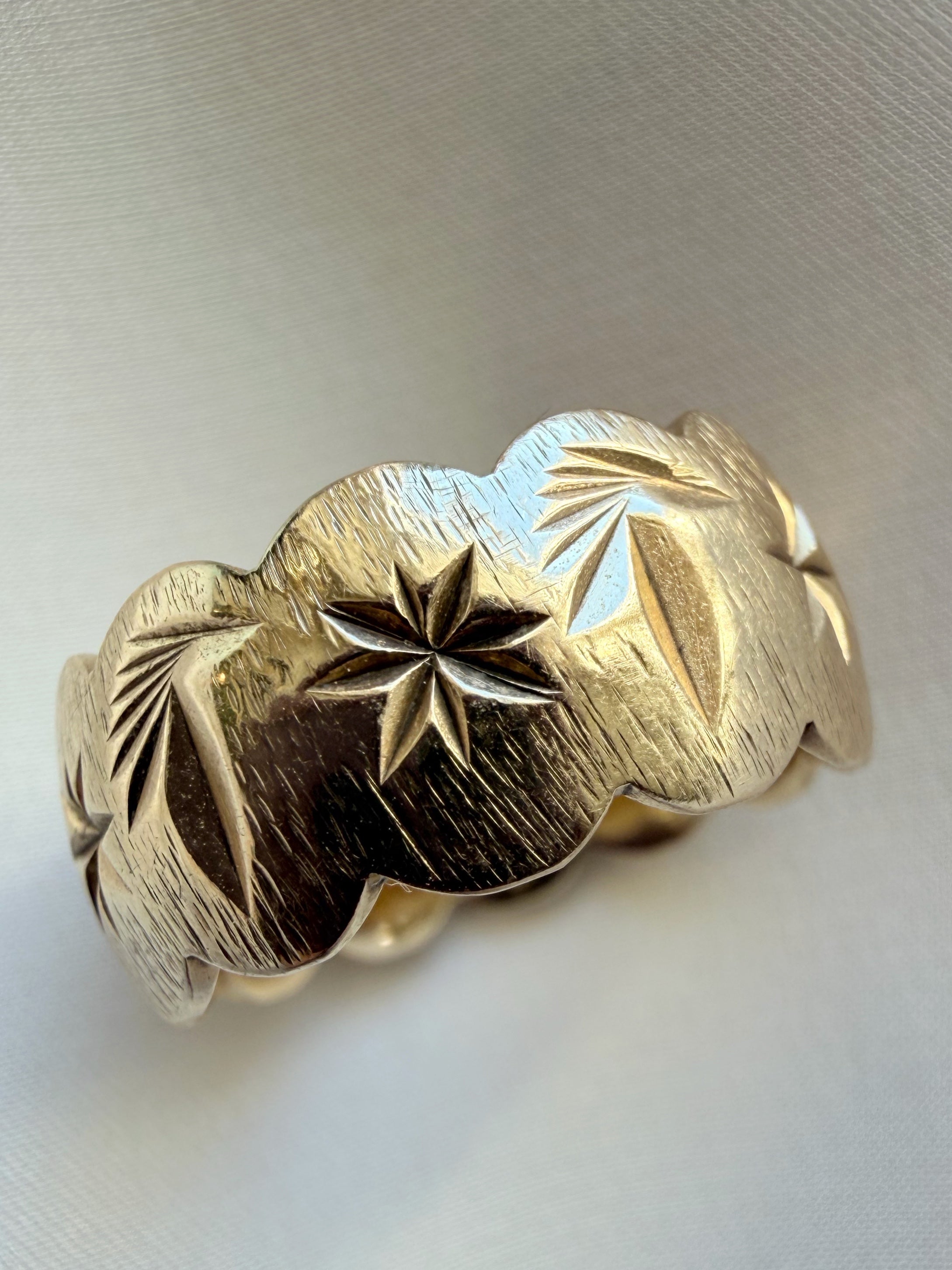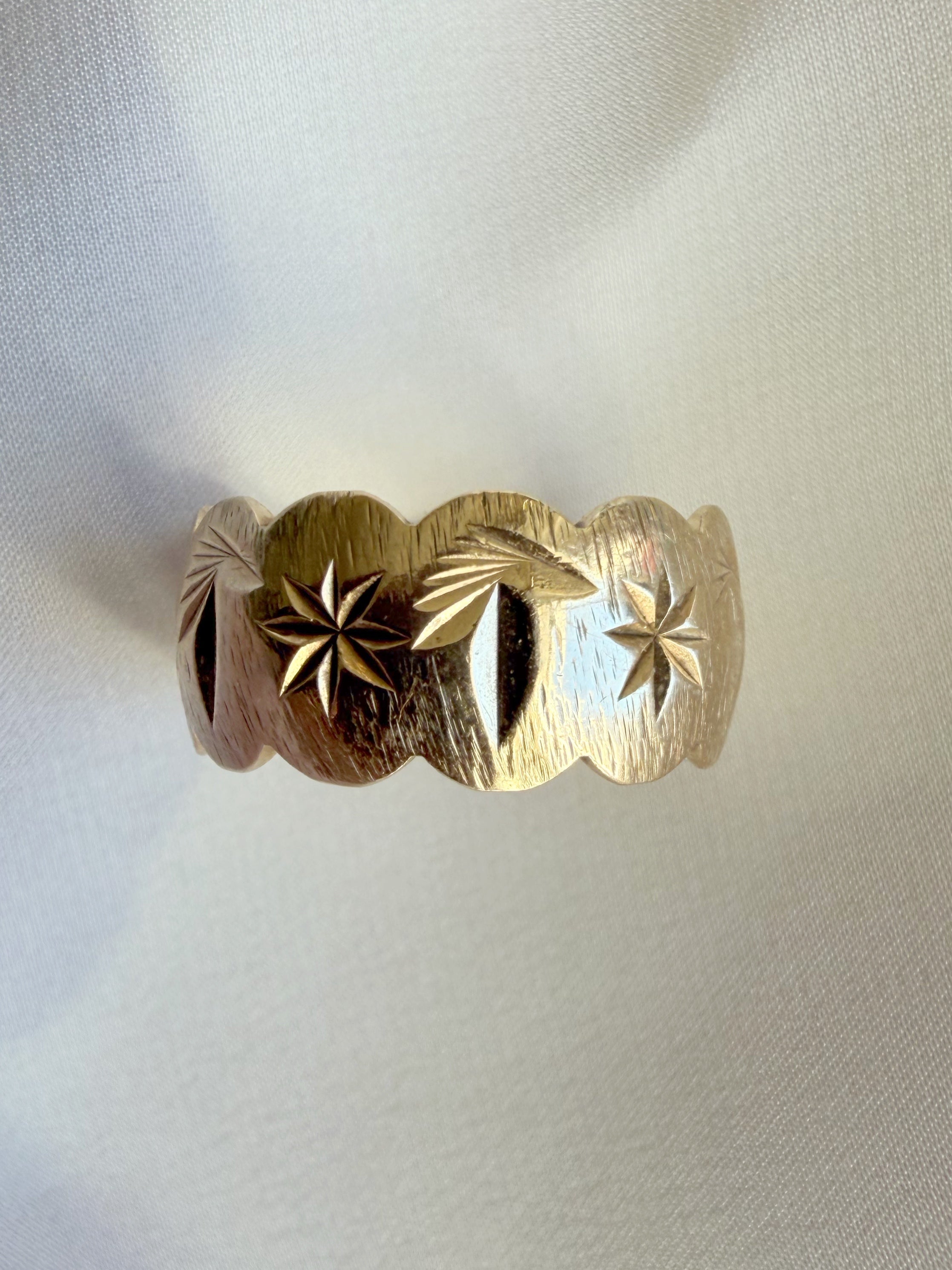 This piece is old school cool all over! With basically no signs of wear, this 8.5mm wide band has a gorgeous scalloped edge and features engraved palm trees & stars.