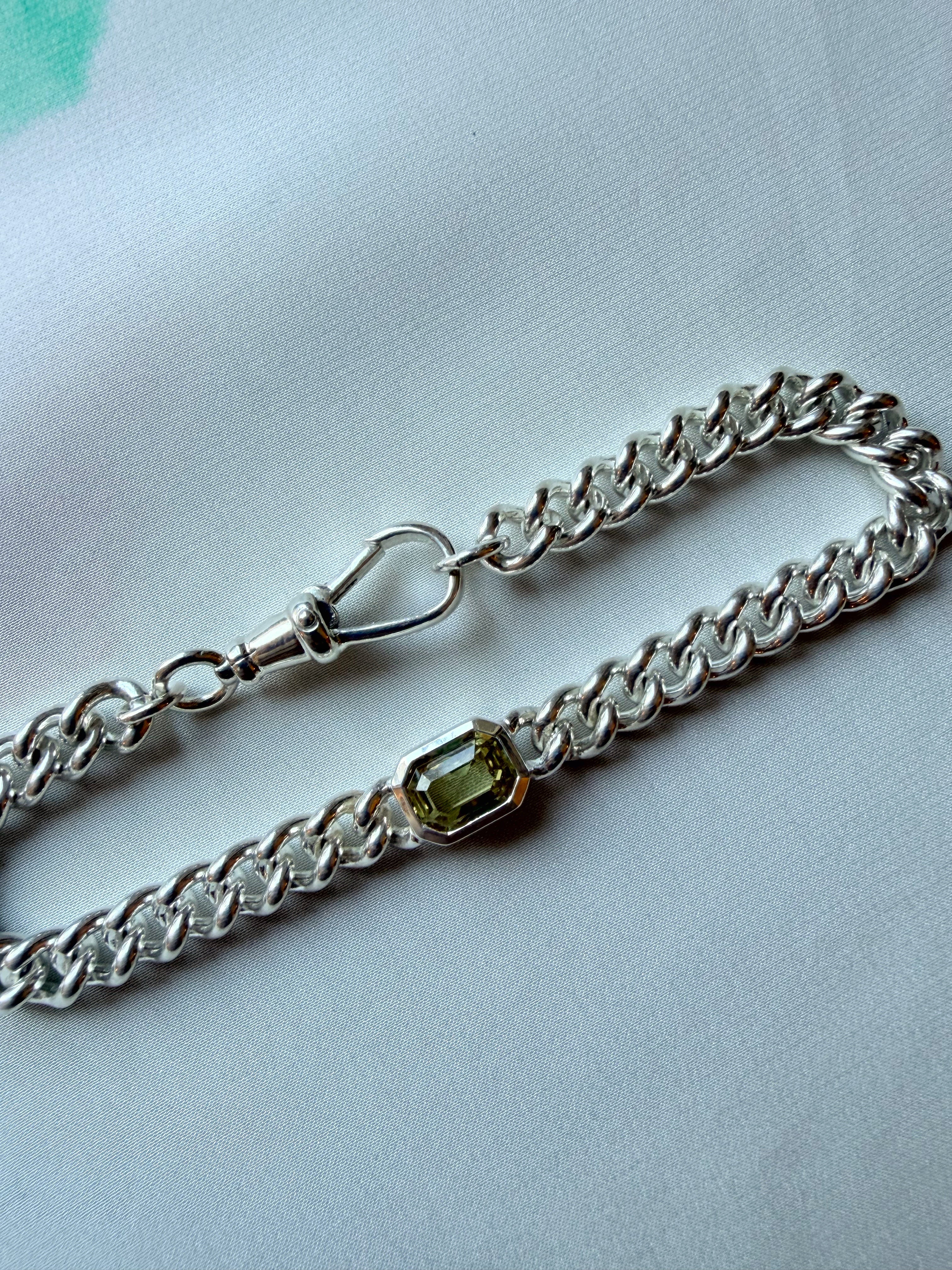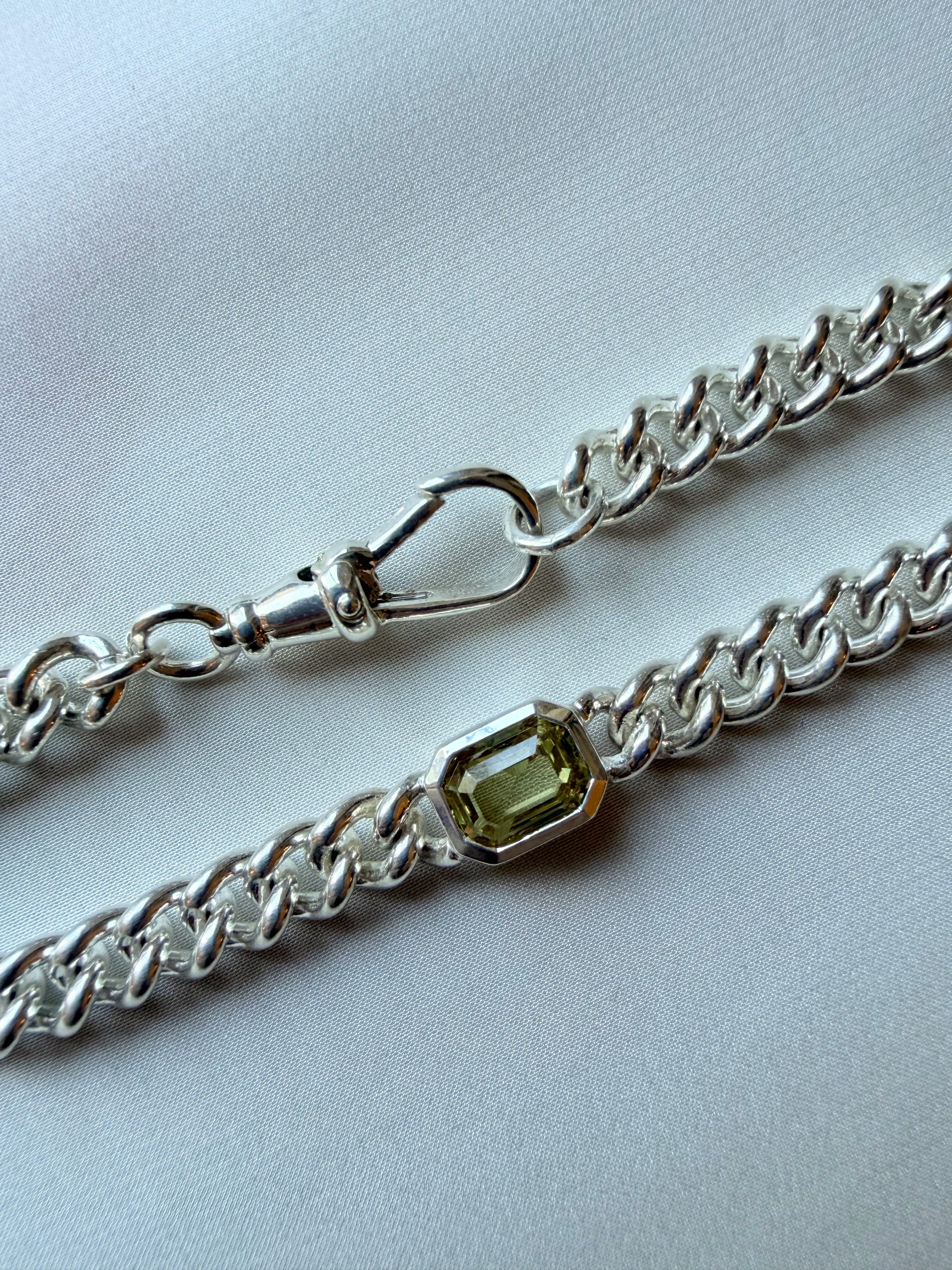 This classic curb chain is made of solid silver (it is not hollow) and finished with a dog clasp, it is ungraduated and the links are 5.4mm wide. The chain was newly made in the UK and we have bezel set the stone with our very pleasing bubble back setting.