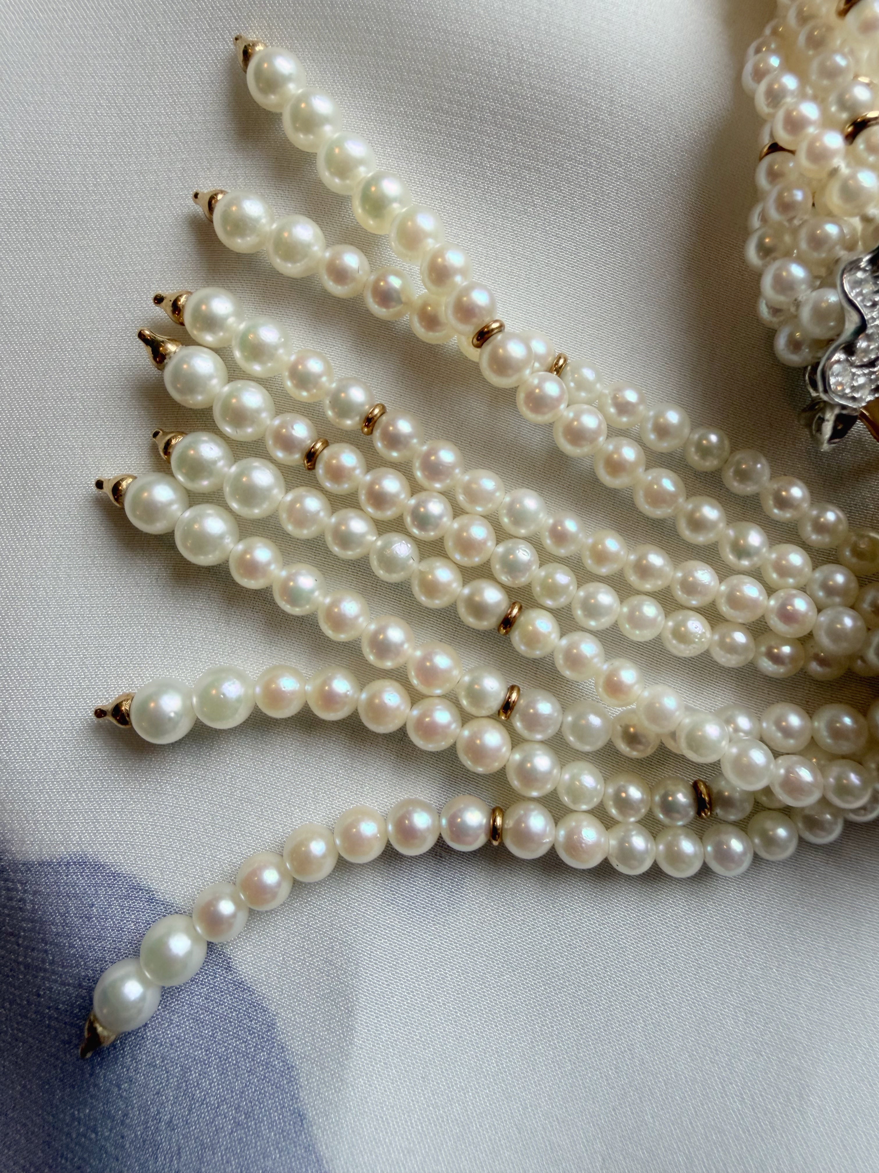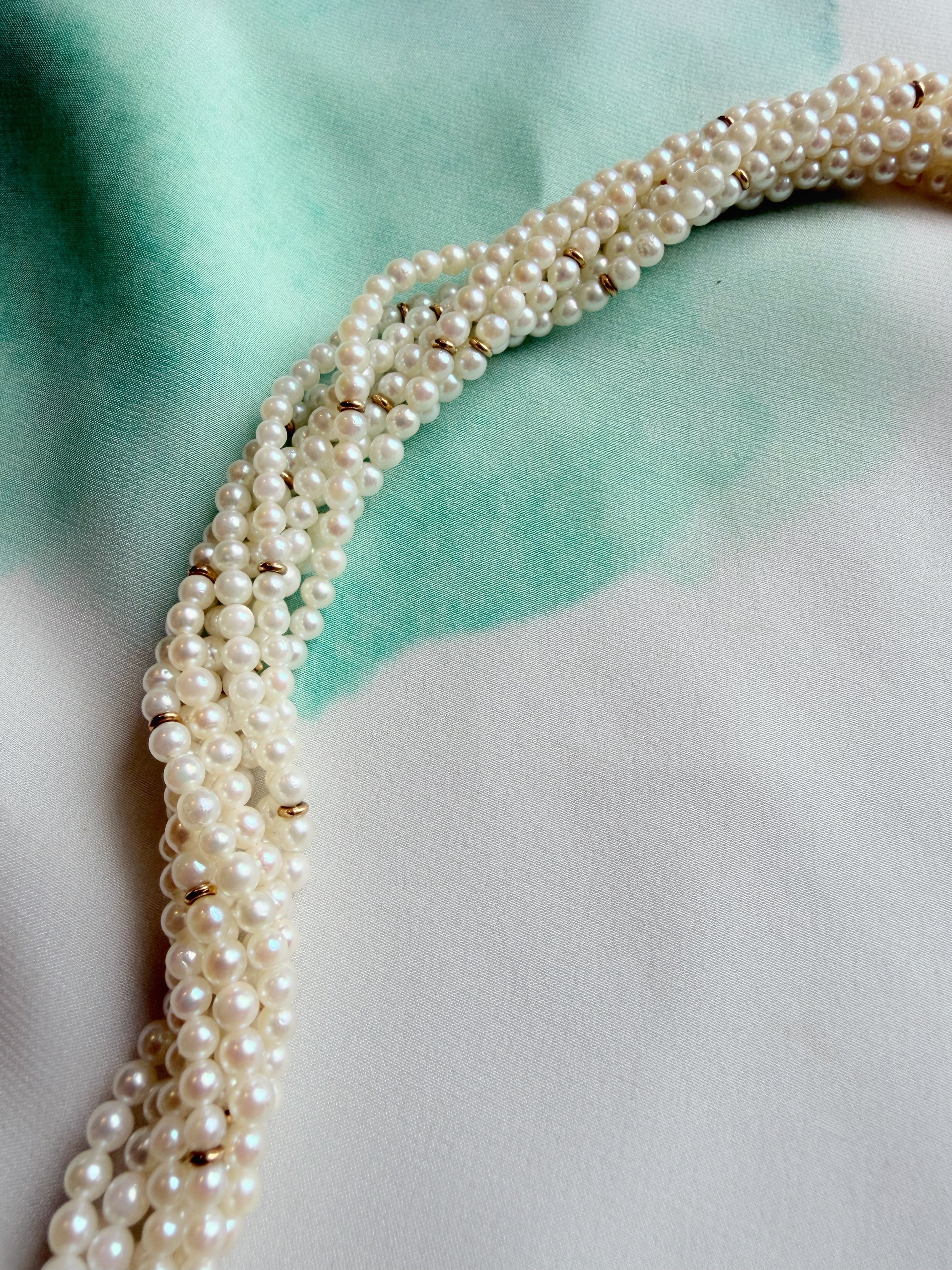 The necklace is made from 8 strands of cultured pearls interspersed with 18ct gold beads. It can be worn twisted or loose, and is wildly elegant!